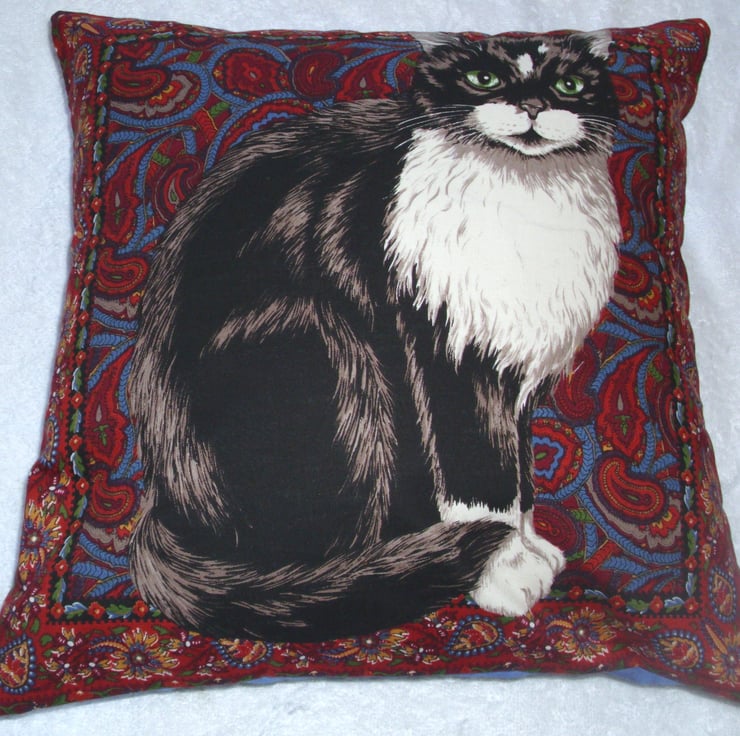 A square cushion with a beautiful black and white cat with green eyes sitting upright on a red and blue tapestry rug. lovely and soft cushion ,would look good in any lounge, sitting room, study or office on any settee or armchair or in a conservatory or summer house or on a bed.