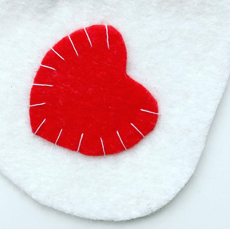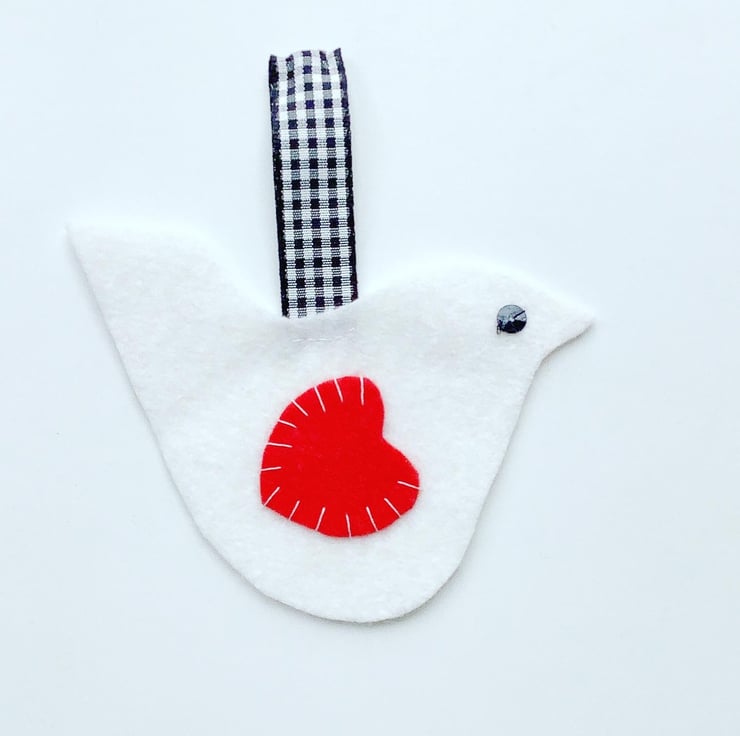 It is made from white felt with a contrasting red felt heart wing which has been hand sewn using white embroidery thread. A black and white gingham ribbon is attached for hanging.
