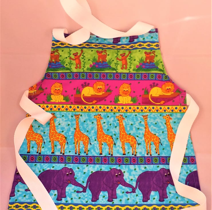 A gorgeous brightly coloured apron, this has happy lions, monkeys, giraffes, crocodiles and purple elephants depicted within stripes. I have made it of a good quality machine washable cotton, with white acrylic webbing straps. It measures approximately 16" (41 cm.) from neck to hem, and 14" (36 cm.) at the widest point, and will fit a child from about 2-5 years. The child in the photo wearing a different apron is three years old.