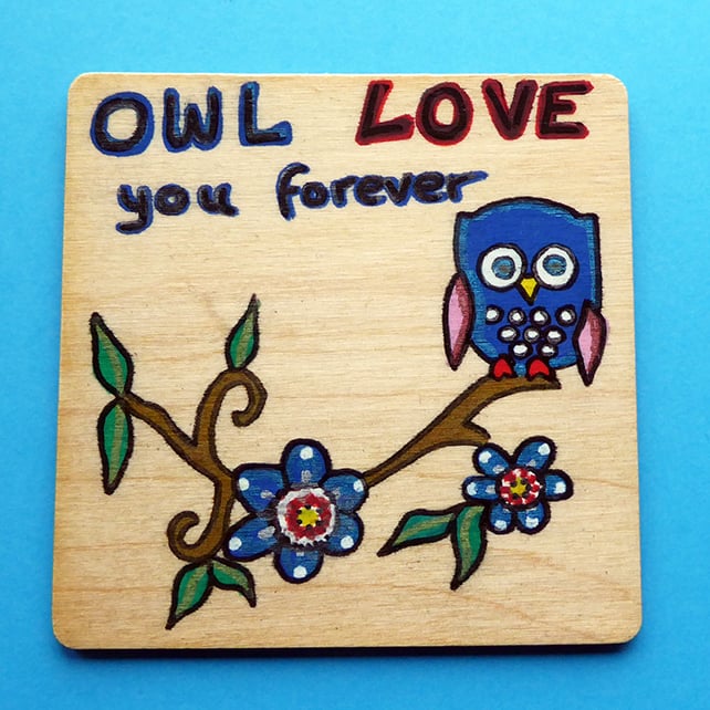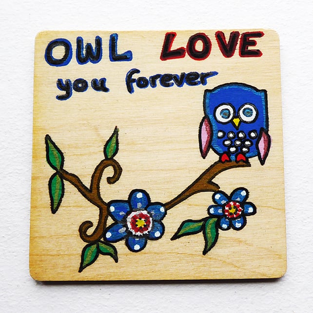 It features a fun owl design with the words ‘OWL Love you forever’ hand painted with acrylic paint and permanent black ink.