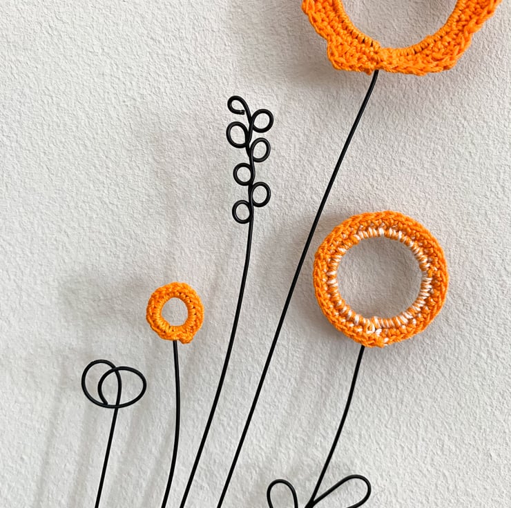 Wire flower stems with cotton crocheted flower heads add cheer to any space.