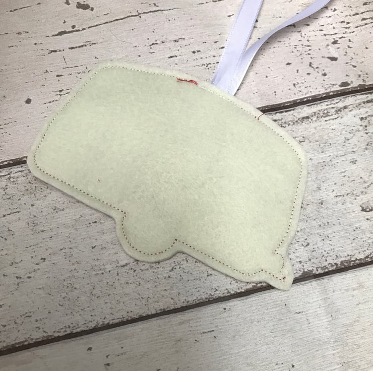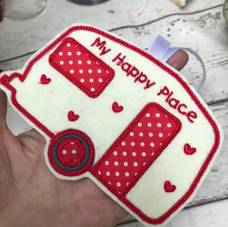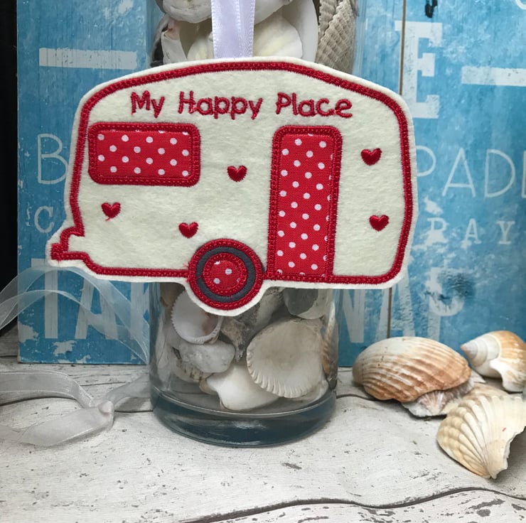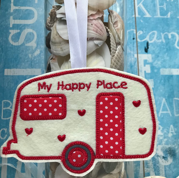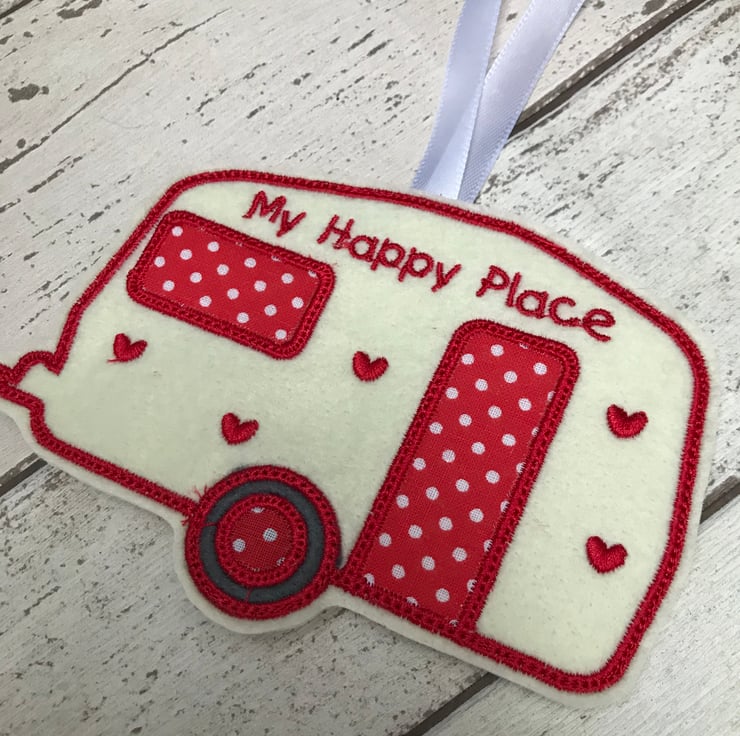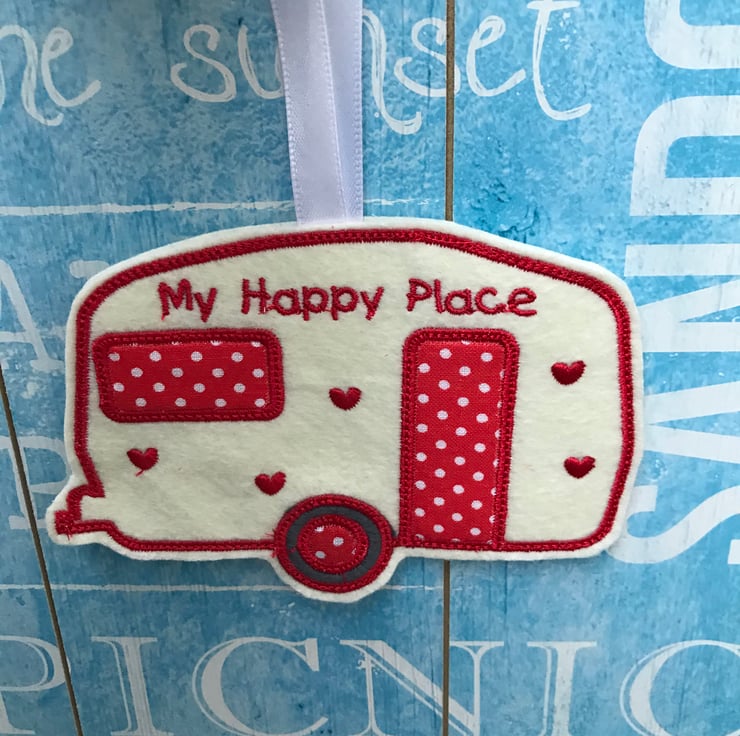 My Happy Place caravan sign. A cute boho hippie caravan felt decoration designed by me. A perfect sending gift for anyone missing their caravan. Made with cream felt and polka dot fabric. In a 80s design era of caravanning. Red colour thread with words My Happy Place.