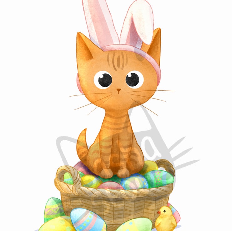 An adorable little Easter print of a ginger cat sitting on top of a basket of colourful eggs. The original artwork was done digitally by me.