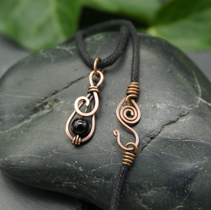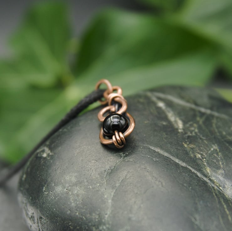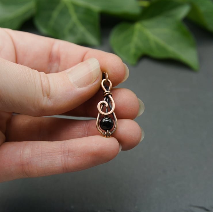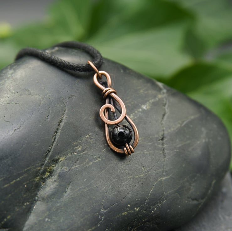 This gorgeous little pendant is entirely handmade from copper wire & features a 6mm round black Onyx bead. I've formed a central spiral & then hammered it flat, before looping the wire above & then back down to form a teardrop shape. The Onyx bead sits in the bottom of the drop - the black bead against copper looks really pretty, a classic combination which will work with any outfit.