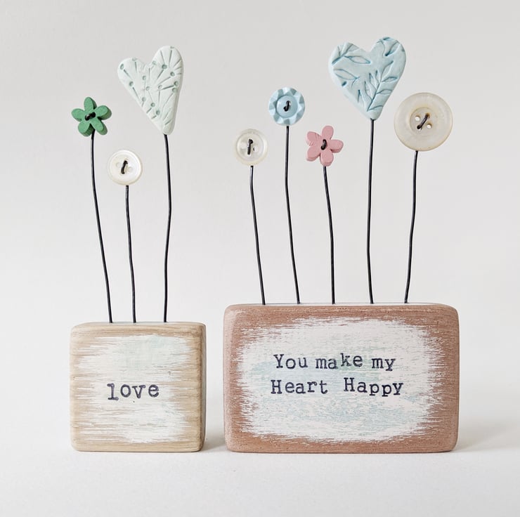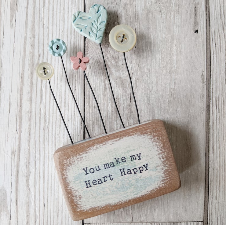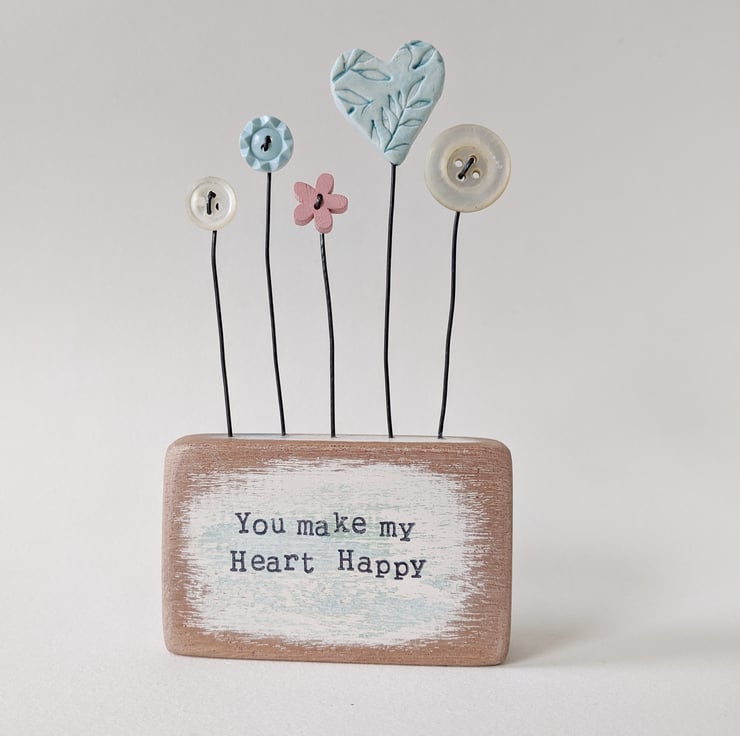 Clay Heart and Buttons in a Painted Wood Block 'You make my Heart Happy'