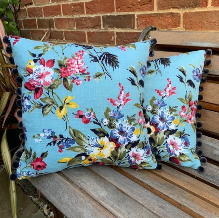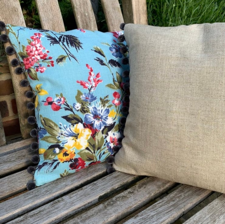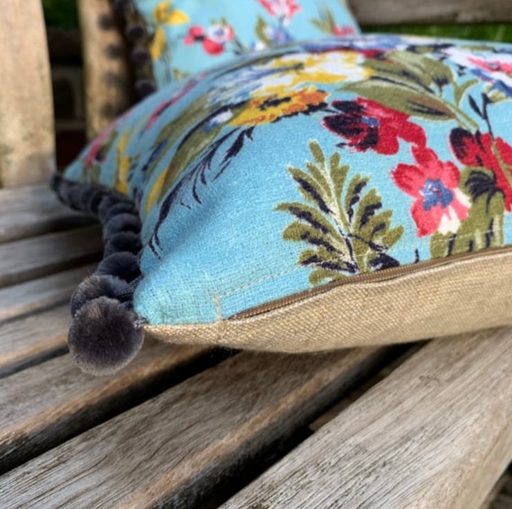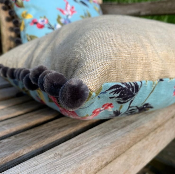 Stunning vintage cotton barkcloth cushion cover with dark grey velvety pom pom trim. This colourful floral fabric is backed with an oatmeal linen/viscose mix weave.