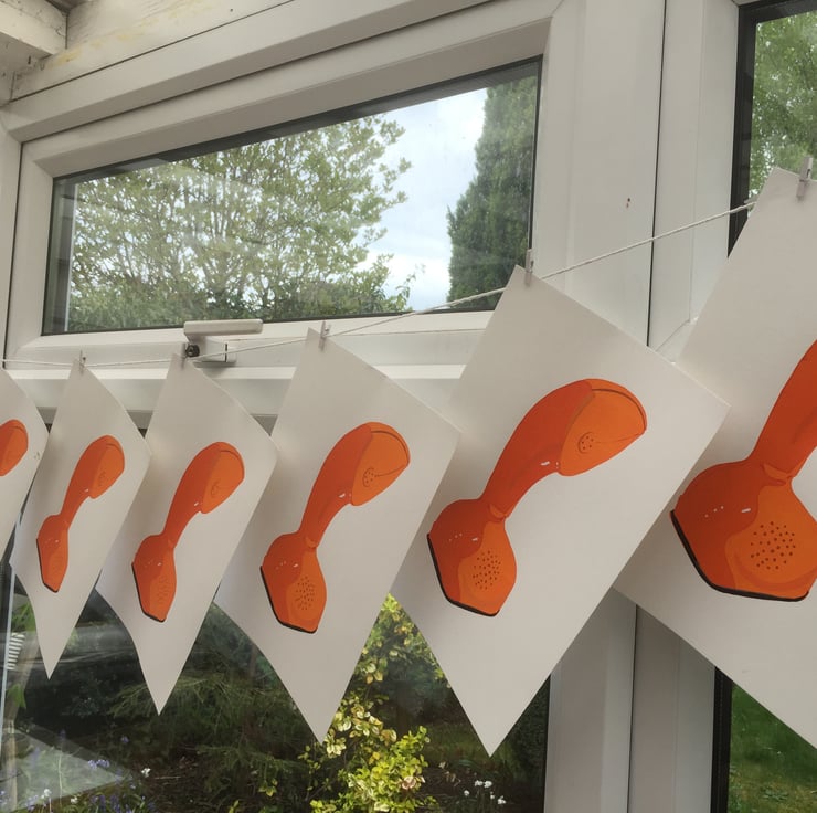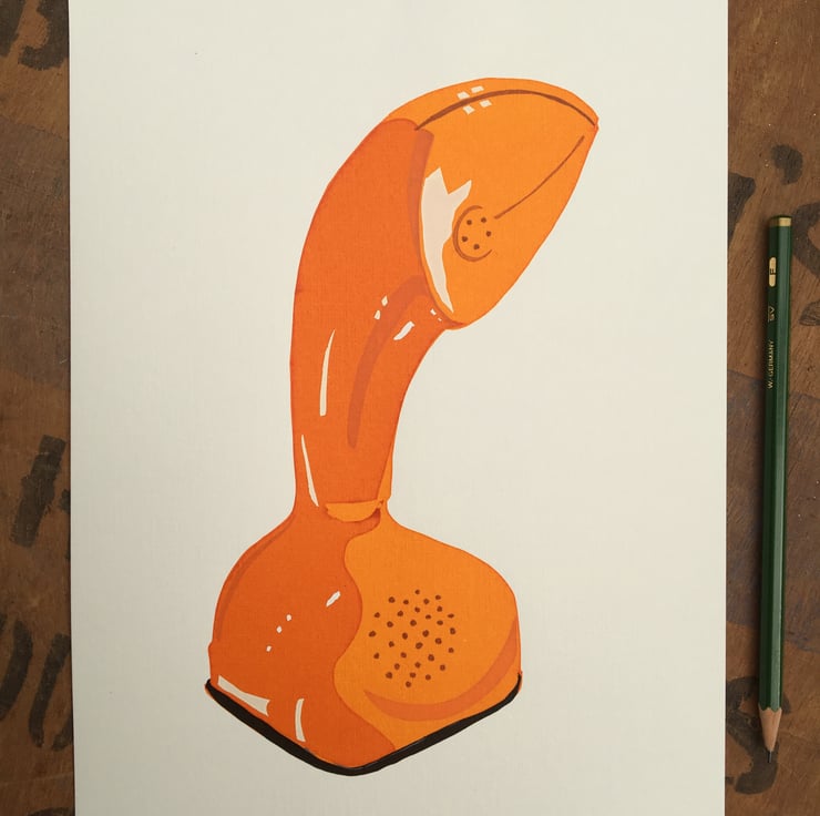 I was fascinated by the shape of this telephone and the number of fun, bright colours that it was produced in. I chose to draw and screenprint my version of the Ericofon in orange because this is the colour that I would mostly associate with the era in which they were made.