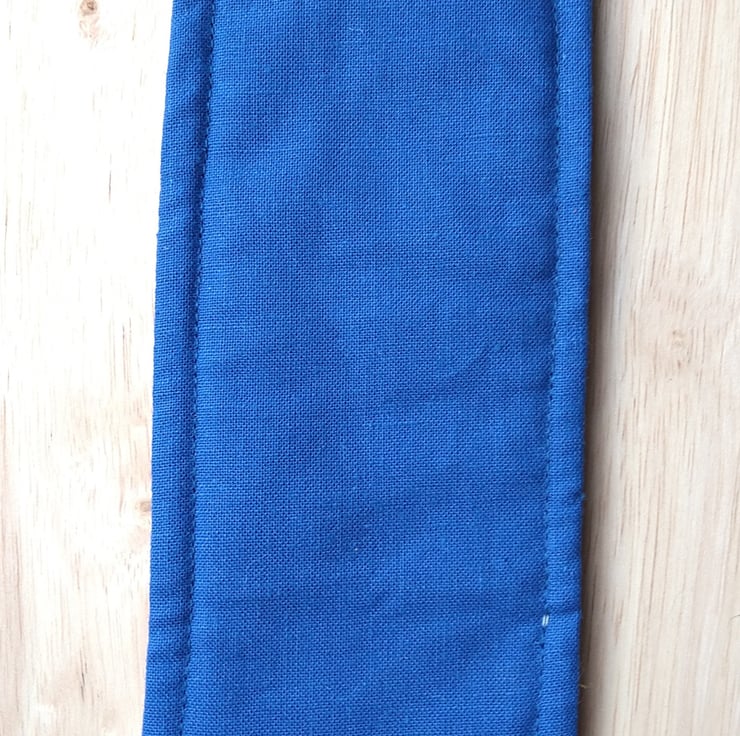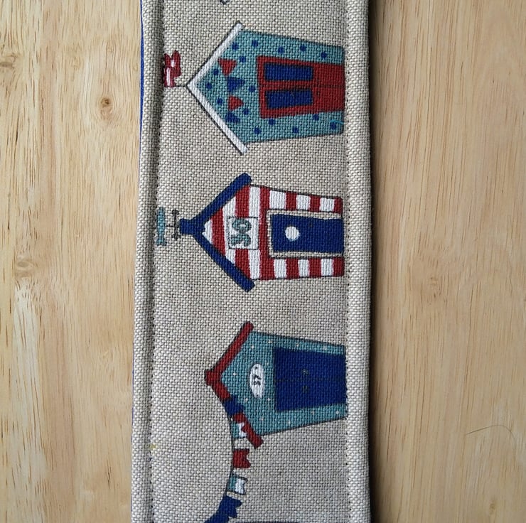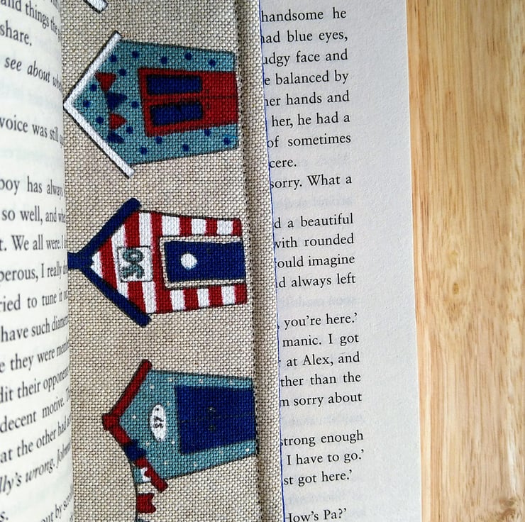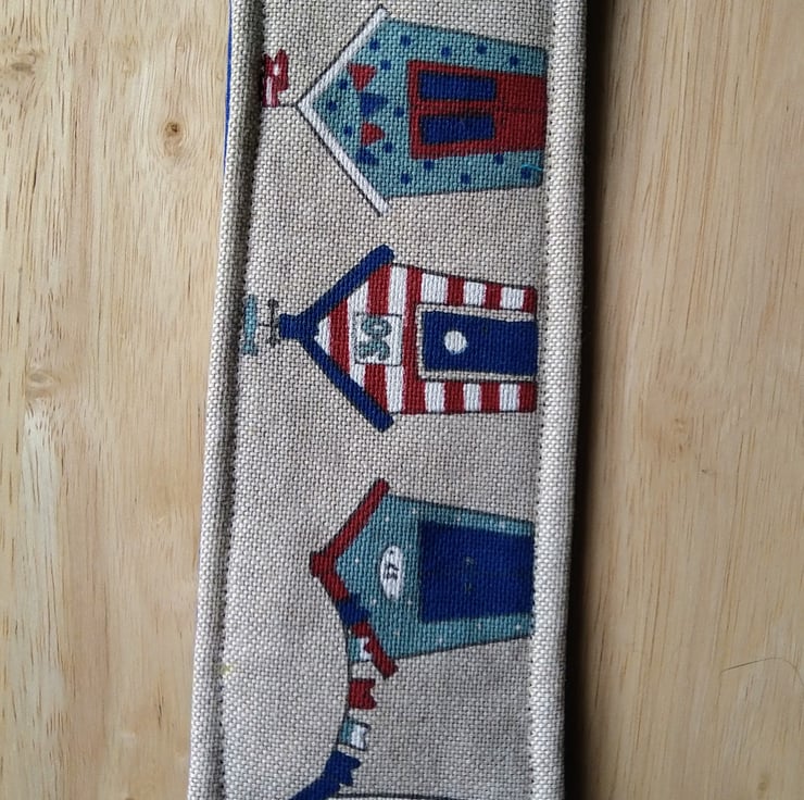 This is a handmade bookmark in a linen blend fabric featuring a collection of beach huts. It is padded with fusible fleece and the back has a contrasting royal blue cotton fabric. There's a checked gingham ribbon on the lower edge to ensure, that you can find it in your book. I have topstitched all around the edge of the bookmark.