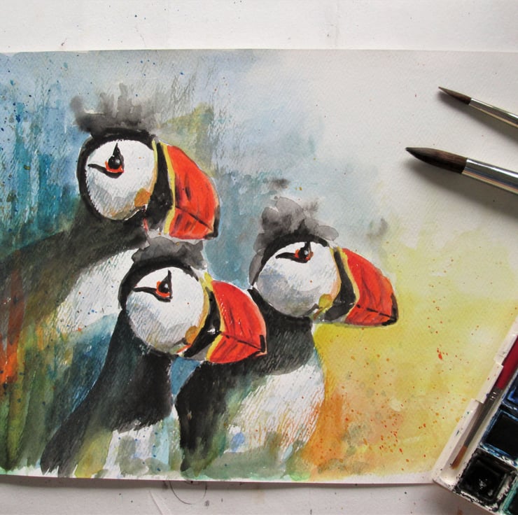 This watercolour painting shows three Atlantic Puffins in a colourful atmosphere.