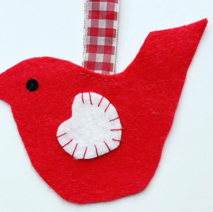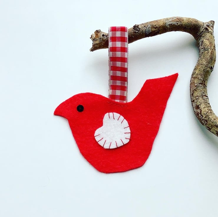 It is made from red felt with a contrasting white felt heart wing which has been hand sewn using red embroidery thread. A gingham ribbon is attached for hanging.