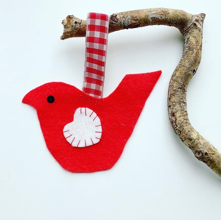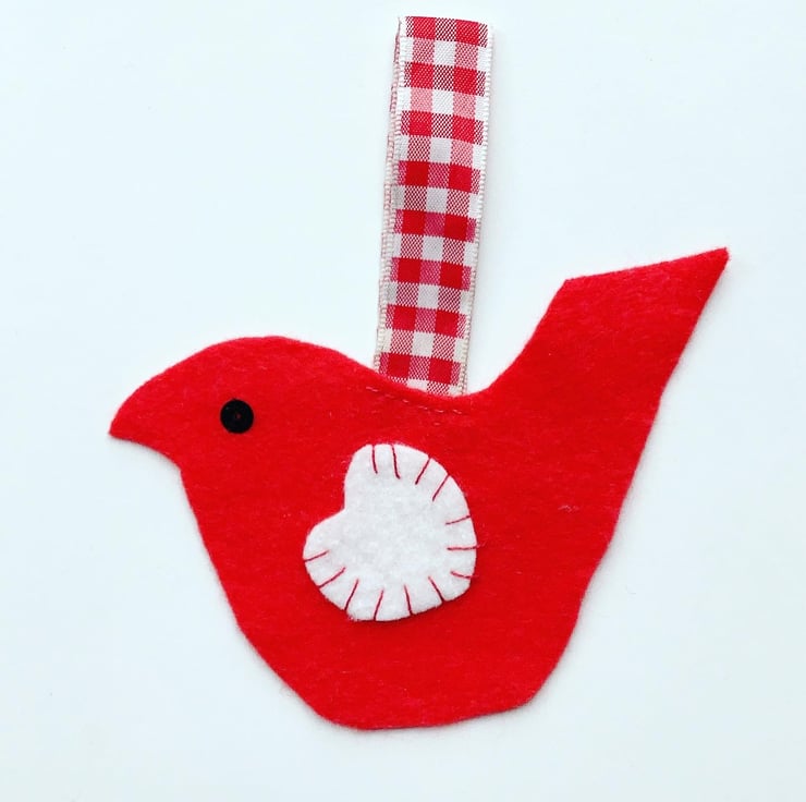It is made from red felt with a contrasting white felt heart wing which has been hand sewn using red embroidery thread. A gingham ribbon is attached for hanging.