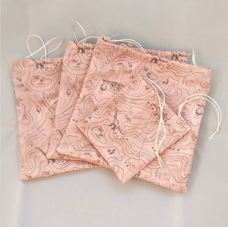 The perfect gift wrap or party bag for your pirate crazy child, these little bags are made from an ancient treasure map, so old, indeed, that there are dinosaurs patrolling the contours. Three of the bags measure approximately 6" square (15 cm.), while the smallest is about 3.5" square (9 cm.).