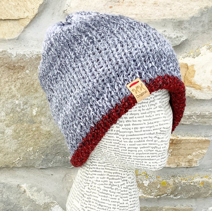 A very cosy hat that would be perfect for winter as it's so thick and warm. It has been knitted in a soft chunky yarn, with shades of grey on one side (100% Acrylic) and red to the other (100% Acrylic).