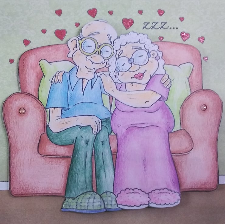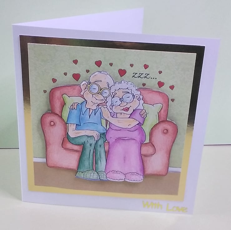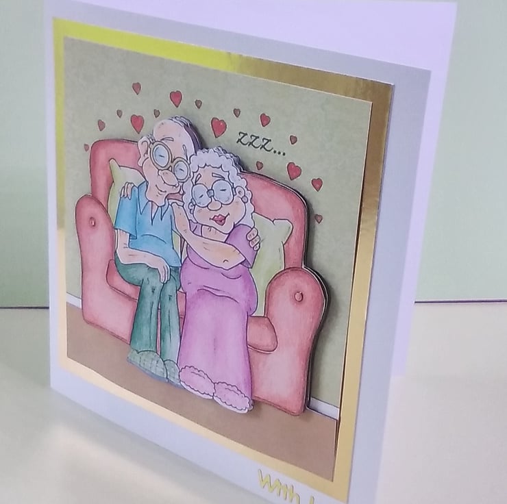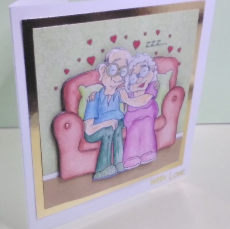 The front of the card features an image of a couple of the sofa having a cuddle, and a snooze. The image has been mounted onto gold foiled card and also 3D decoupage, the hearts at the top of the image have been coloured with a red glitter pen. I've added a gold "With Love" greeting to the bottom right corner.