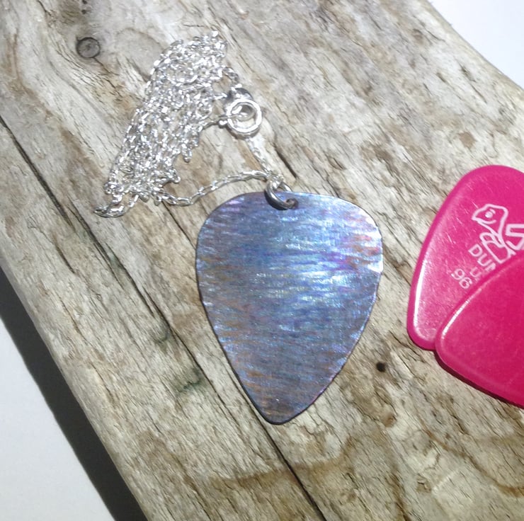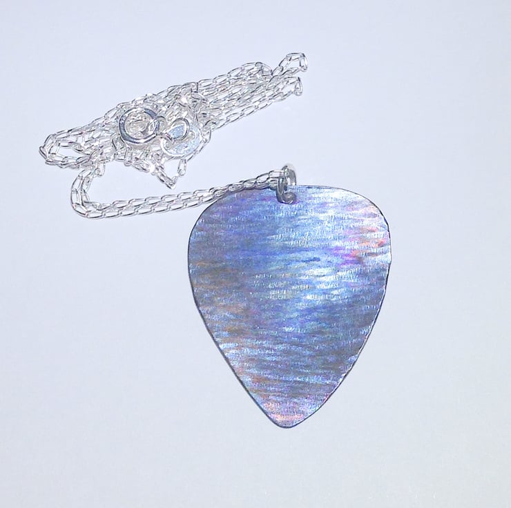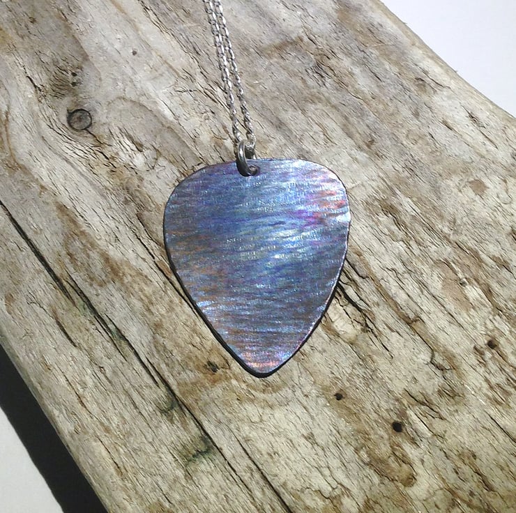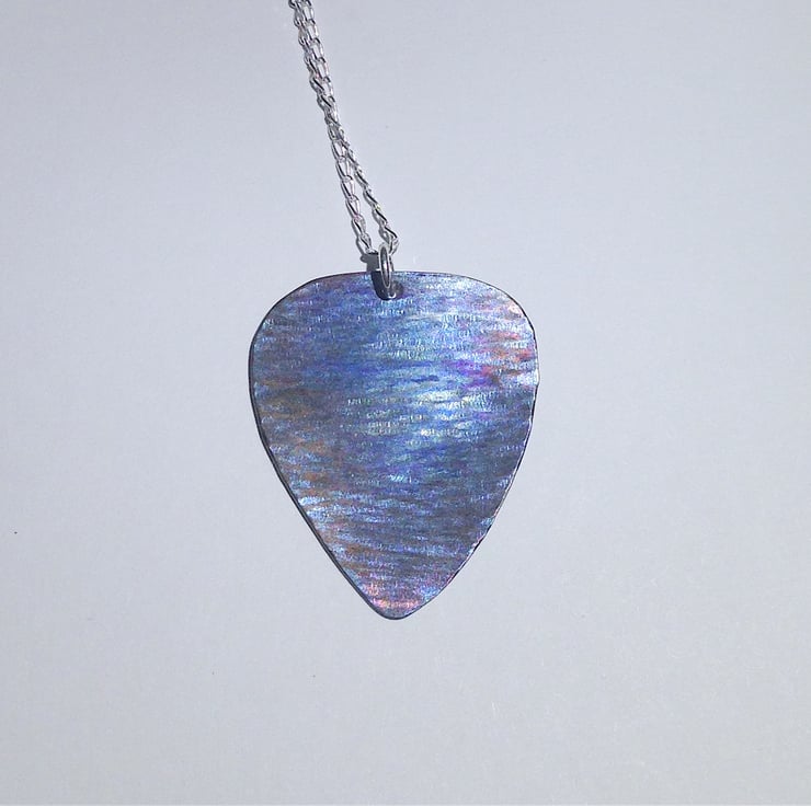 I have made this pendant by hand sawing the shape from titanium sheet. I've given the surface an attractive hammered finish before heat colouring. This pendant is plectrum shaped and is the ideal gift for a music lover however it is purely decorative and isn't intended for actual guitar playing.