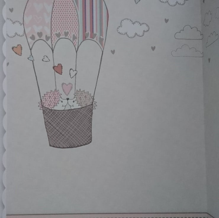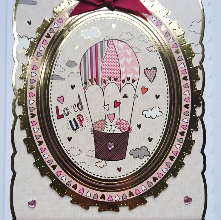 The design is two sweet little hedgehogs floating up up and away into the sky in a hot air balloon. They are touching noses with big smiles on their faces - how cute and happy they are! They are surrounded by lots of floating love hearts, and the sentiment says "Loved Up".
