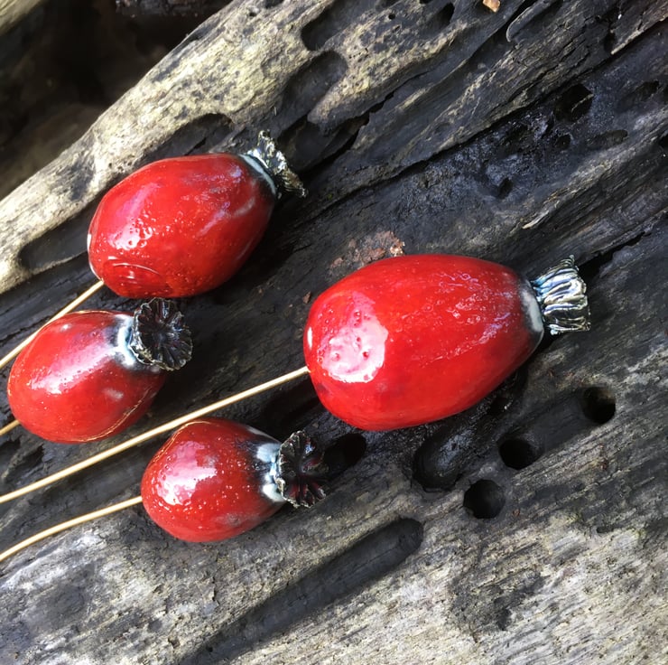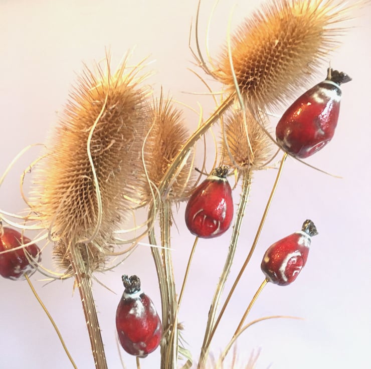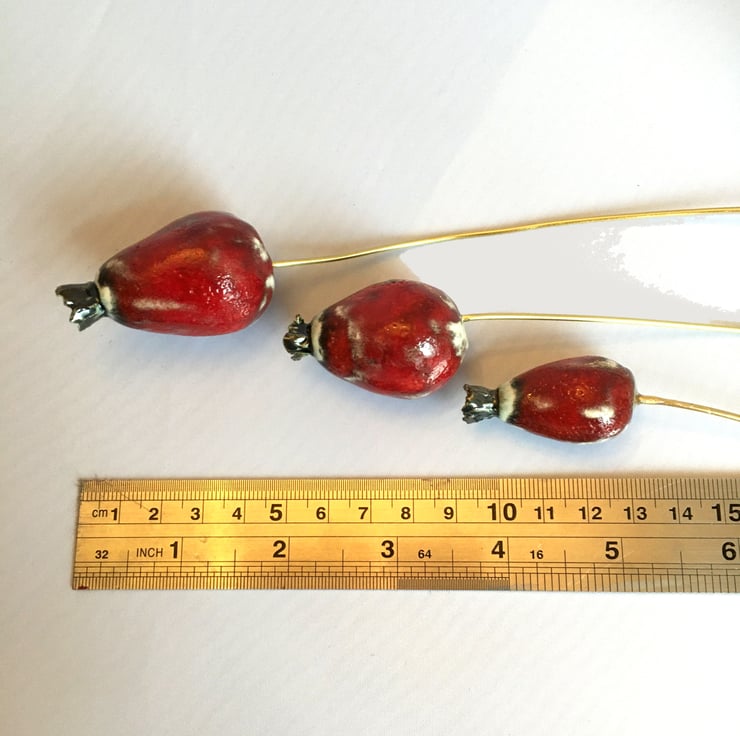 Each Rosehip is hand carved from a fine white clay and glazed with a beautiful glossy red glaze to create realistic looking rosehips. The rosehips have been created in different sizes to create a lovely natural arrangement.