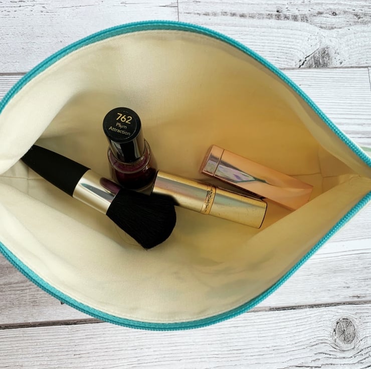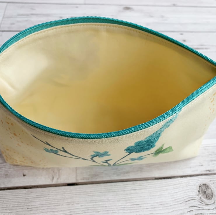 A handy make up bag with turquoise flowers. The cosmetic bag is made from a pale yellow-cream fabric with a floral print pattern. The pattern features a single branched stem of pretty turquoise flowers and green leaves. The pattern on the back features a single green stem with a cluster of blue flowers. Areas of the fabric background have a pattern of blocks of golden yellow speckles. The make up bag fastens with a turquoise zip to match the flowers, and is lined with cream fabric. The base of the bag is boxed giving lots of room inside.
