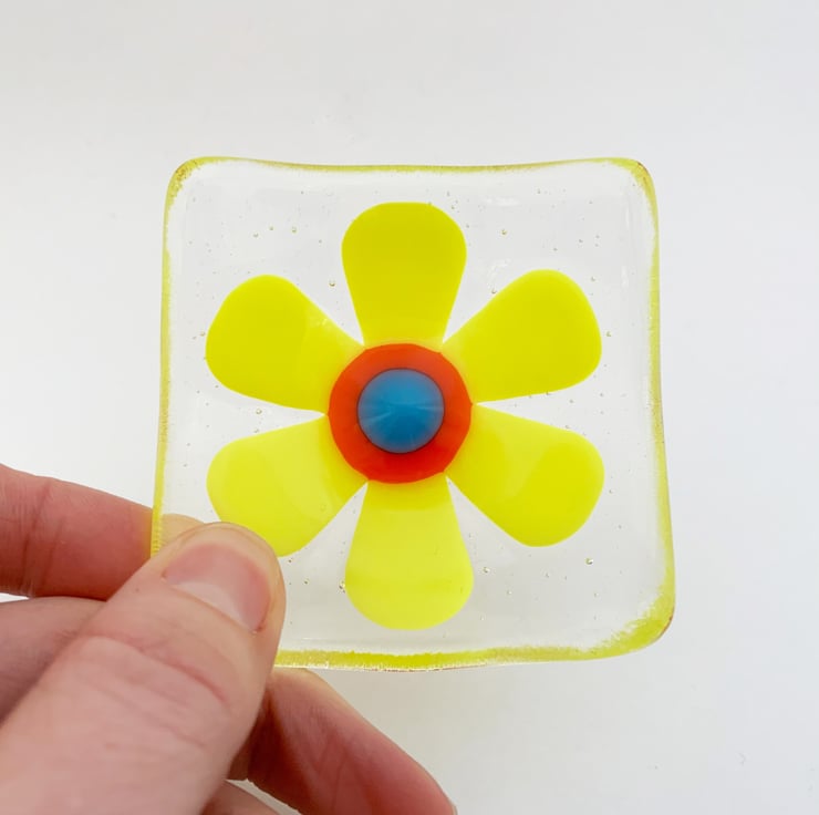 I use yellow, orange and turquoise art glass and hand cut and shape each glass petal and circle. I fuse them to the base glass overnight in the kiln. I then fire the piece a second time to slowly slump it into a ceramic mould. Transparent glass with yellow petals and turquoise and orange centre. All glass is hand cut and assembled, therefore no 2 are exactly the same. One Supplied.