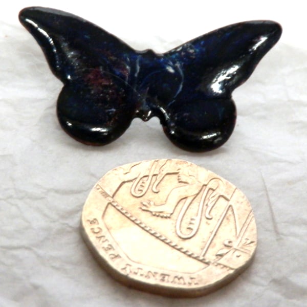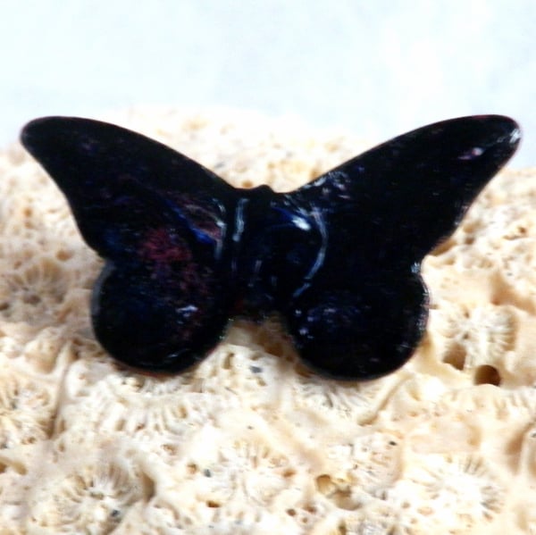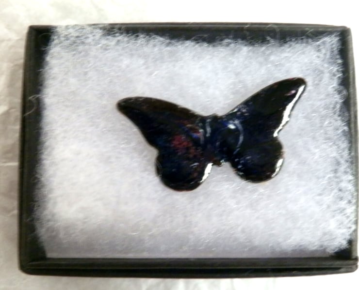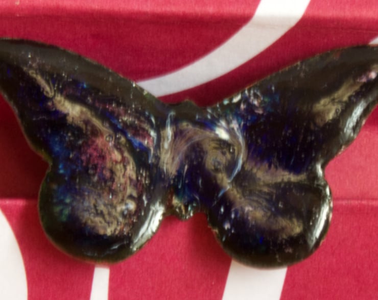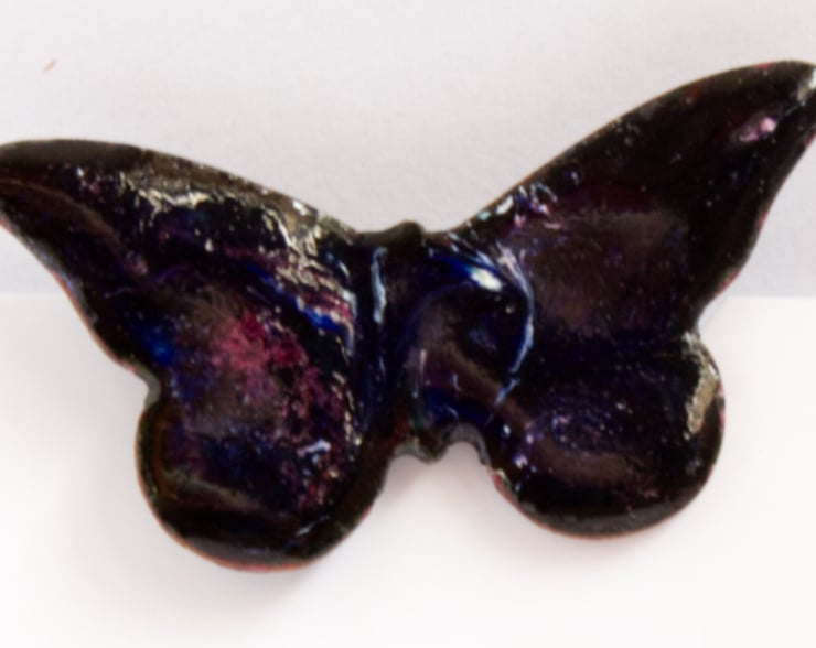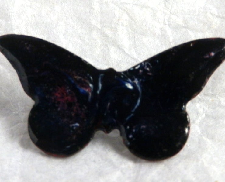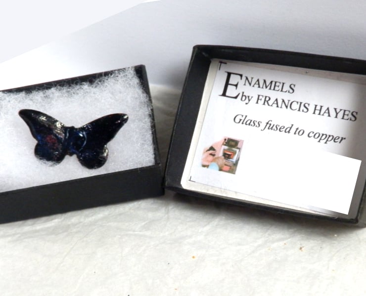 I have scrolled white and dark pink enamel over a dark blue base coat to make this delicate butterfly brooch. Depending on the play of light the dark blue shows black to iridescent royal blue. The white and pink are almost fugitive.
