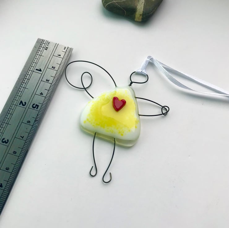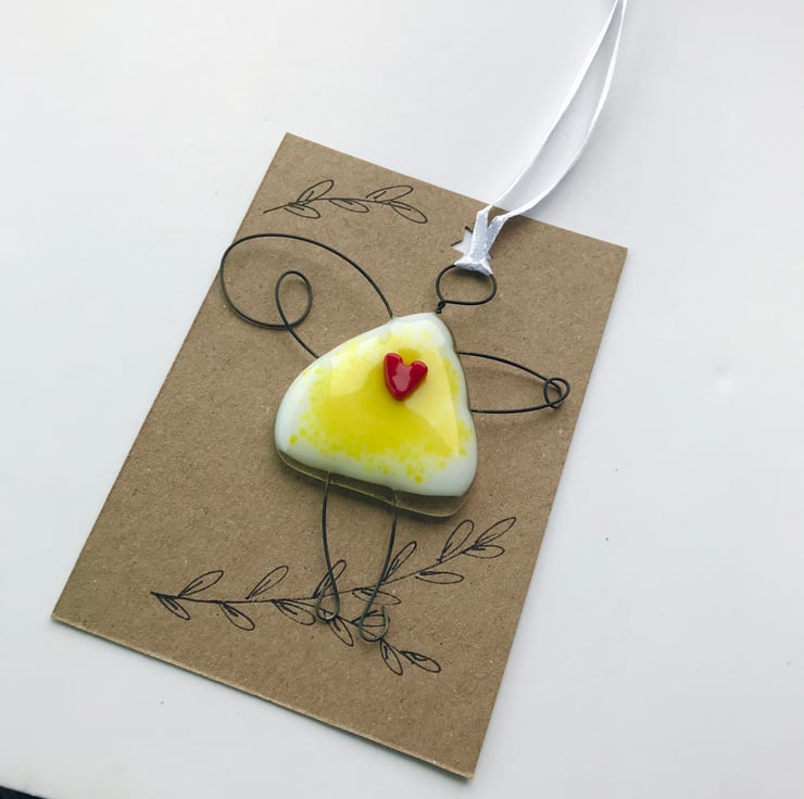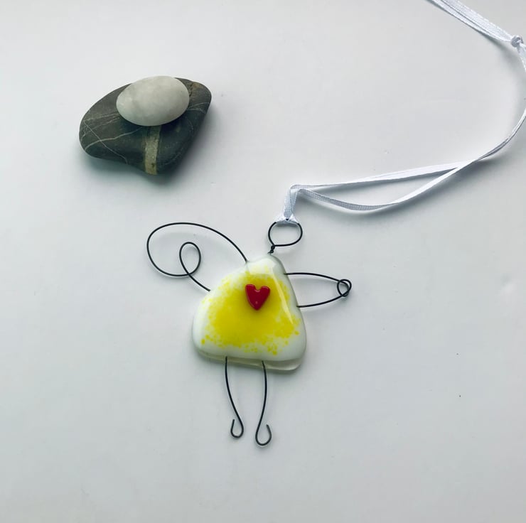 This wire and fused glass fairy is made by me in my yorkshire studio. It would look lovely In a window, on a wall or even hanging on the tree branch during the summer. It would make a lovely small gift for a friend or family member.