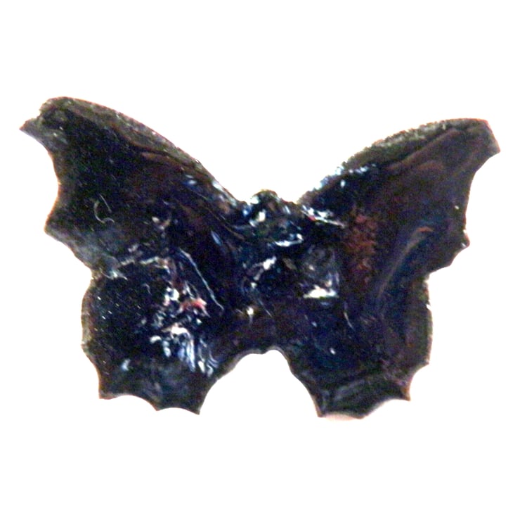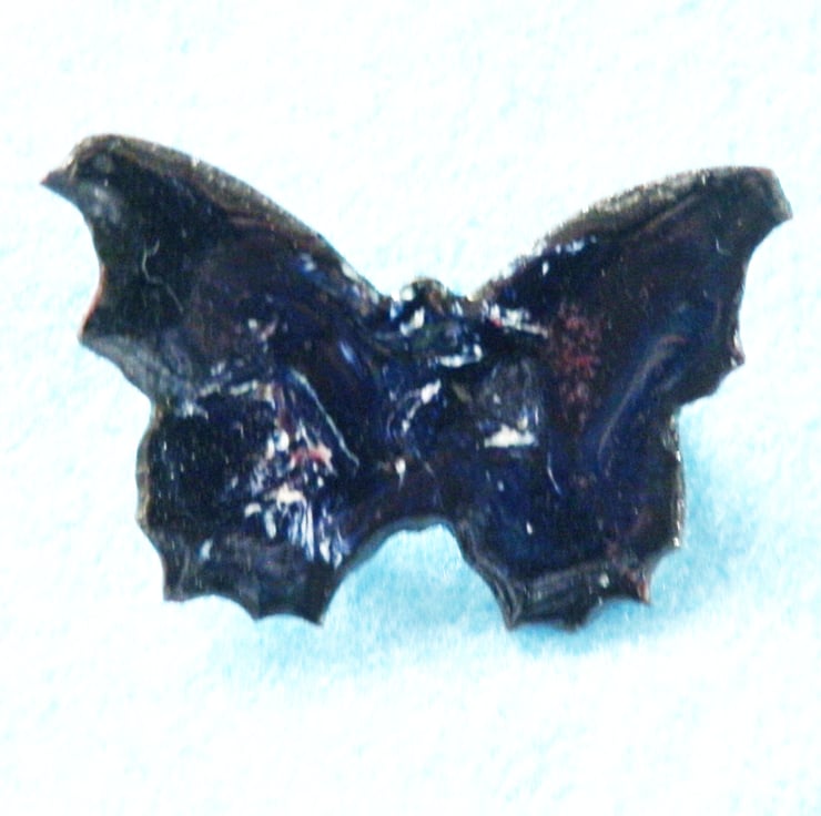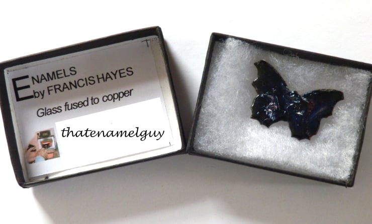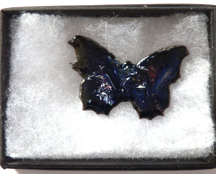 I have scrolled dark pink and white enamel over a dark blue base coat to make this delicate butterfly brooch. Depending on the play of light the dark blue shows black to iridescent royal blue. The white and pink are almost fugitive.