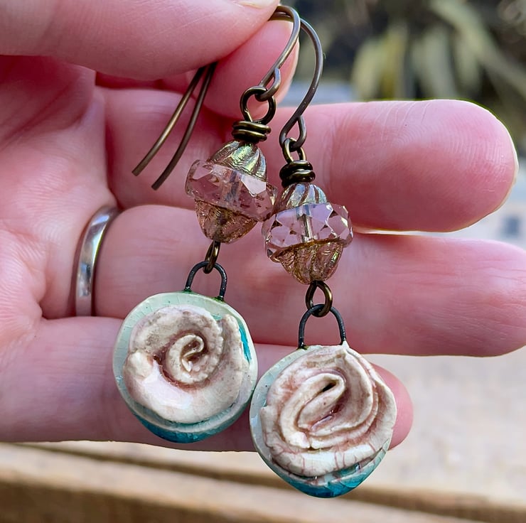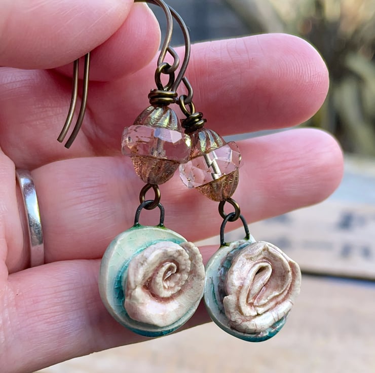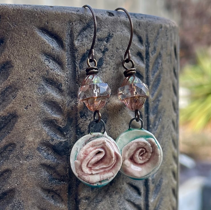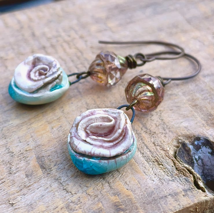 Handmade Ceramic Rose Earrings. Rustic Floral Earrings. One of a Kind Jewellery