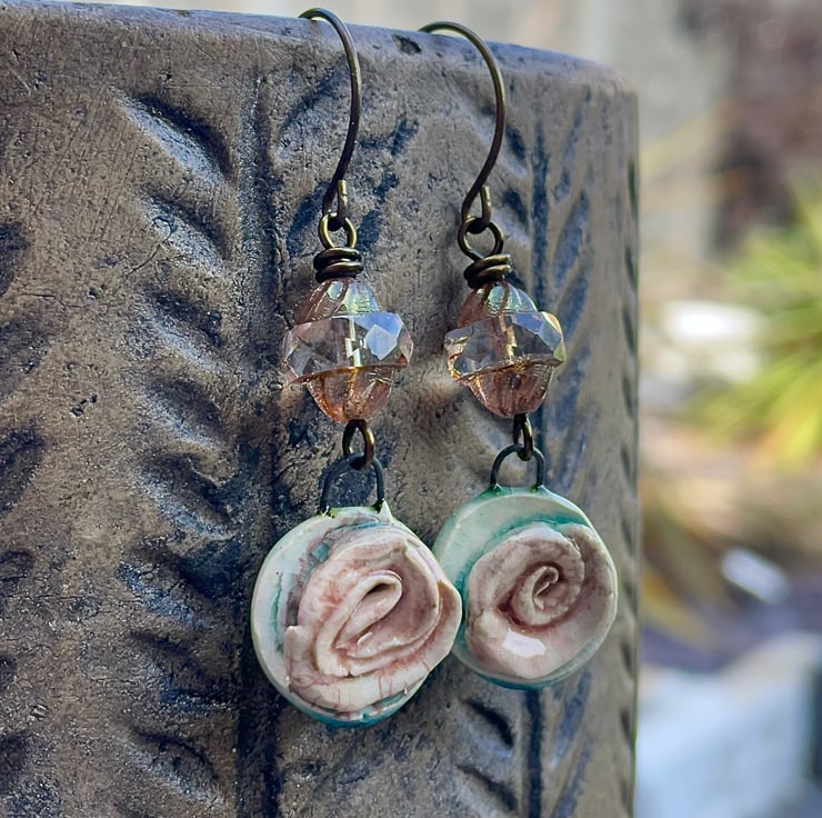 These handmade artisan earrings feature beautiful ceramic rose charms created by bead artist Petra Carpreau. Each rose is full of delicate detail, glazed in a soft blush pink on the front and finished with a vibrant crackled turquoise on the back — making them just as lovely from every angle.