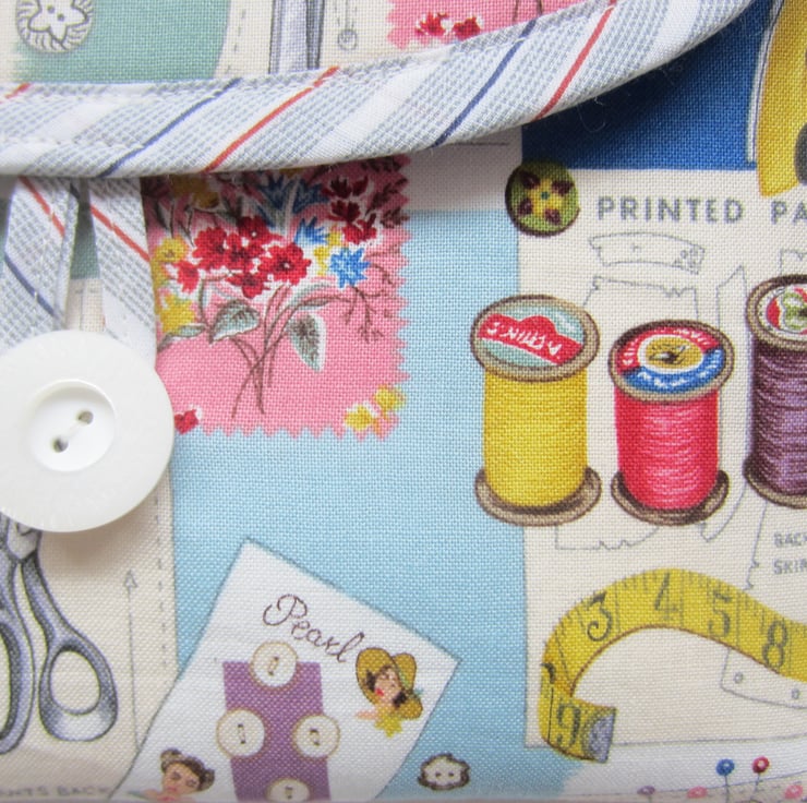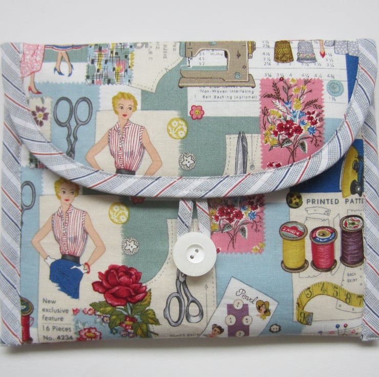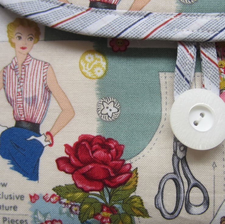 Lightly padded make up bag made with a lovely fabric featuring 1950 s sewing items and fashion ladies. It is edged with a grey, white, blue and red striped bias binding and lined with a white waterproof fabric.