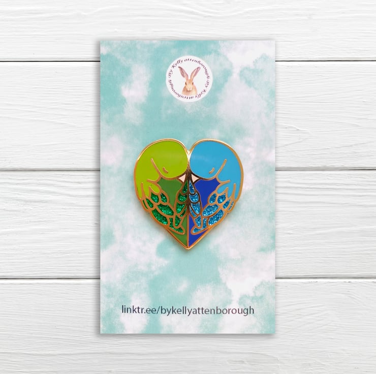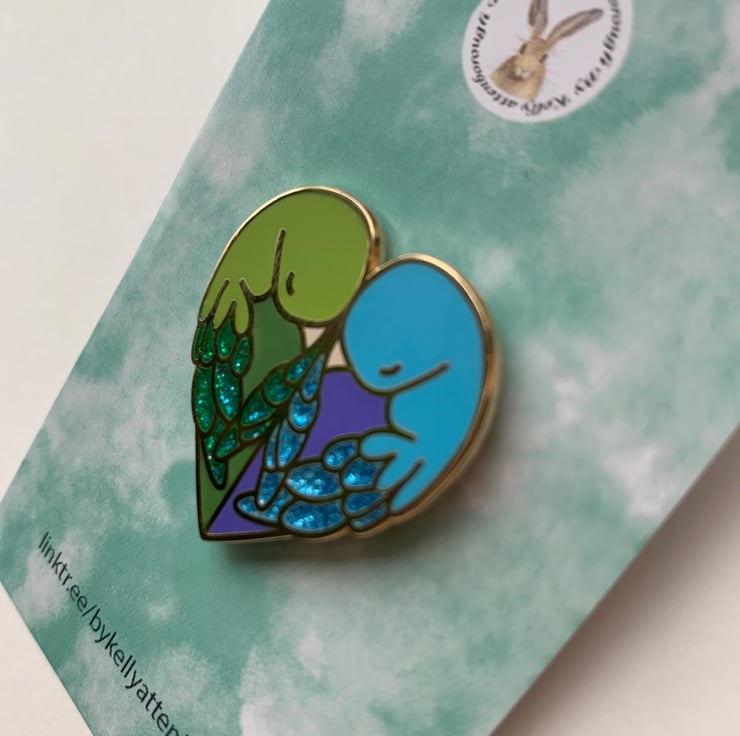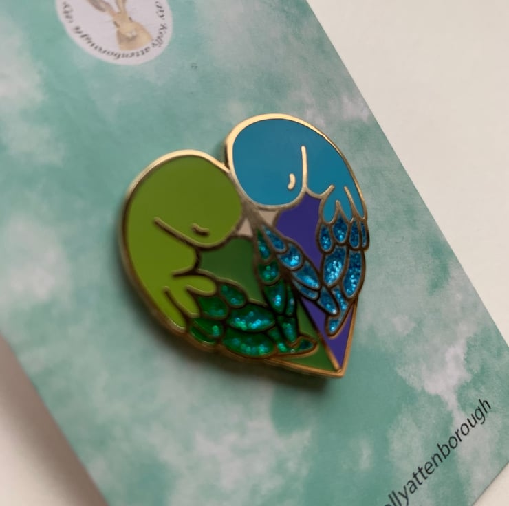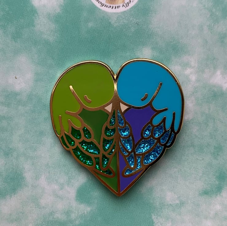 This love bird parrot pin badge makes a great gift to a loved one or bird lover. The pin is heart shaped approximately 30mm, is gold plated with green and blue enamel. Also includes glitter on the parrots wings to add the extra sparkle. This pin has been based on two parrolets (very small parrots) huddling up to each other as they sleep.