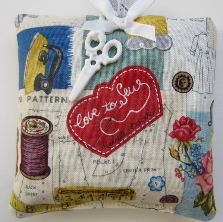 Lavender sachet made from a lovely fabric featuring 1950 s sewing items and decorated with a white ribbon bow and a white scissors button. It hangs with a matching striped loop.