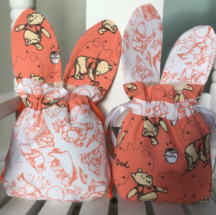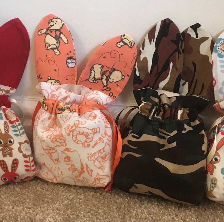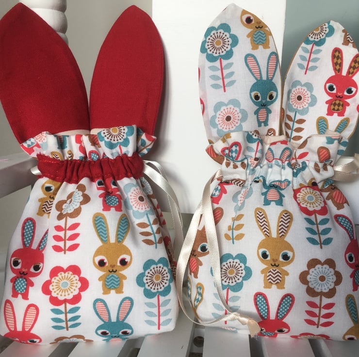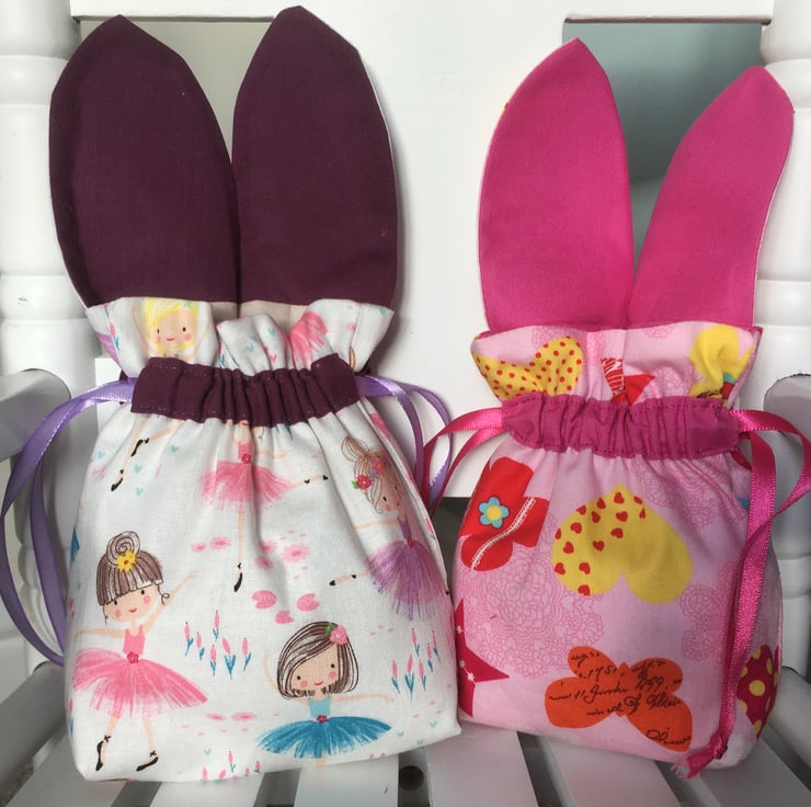 Small drawstring bags with bunny ears. They are perfect to fill with Easter treats or sweets! Or why not use them to collect eggs when on an Easter egg hunt!
