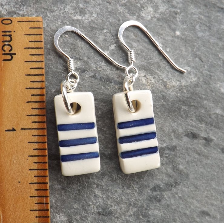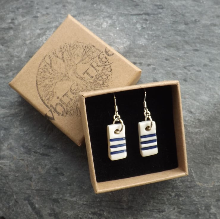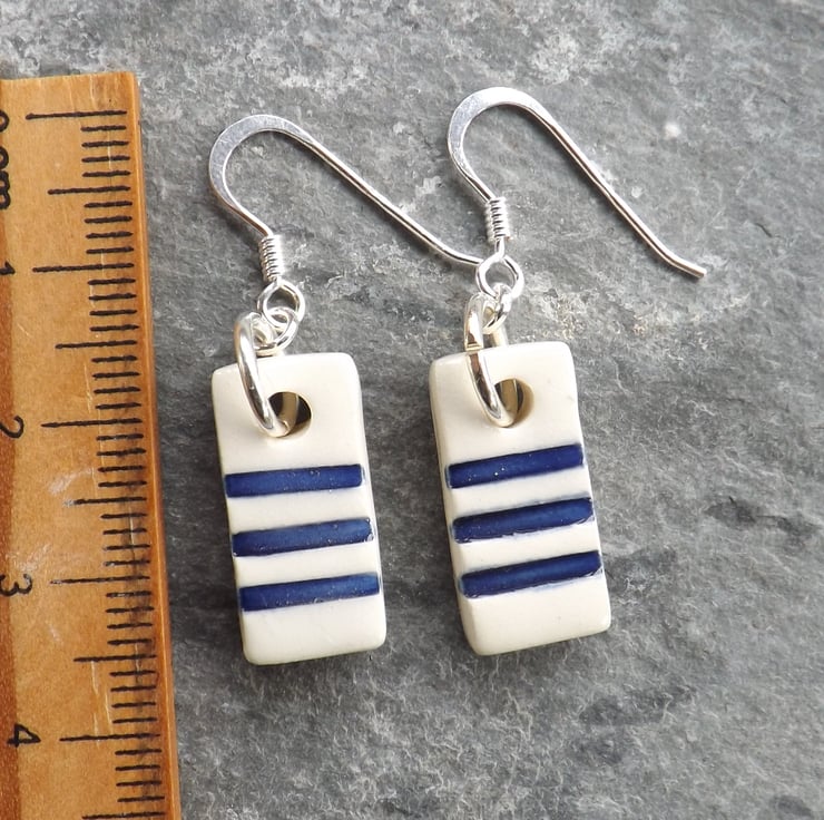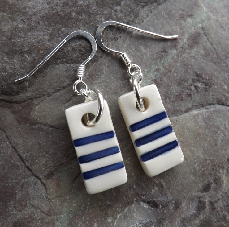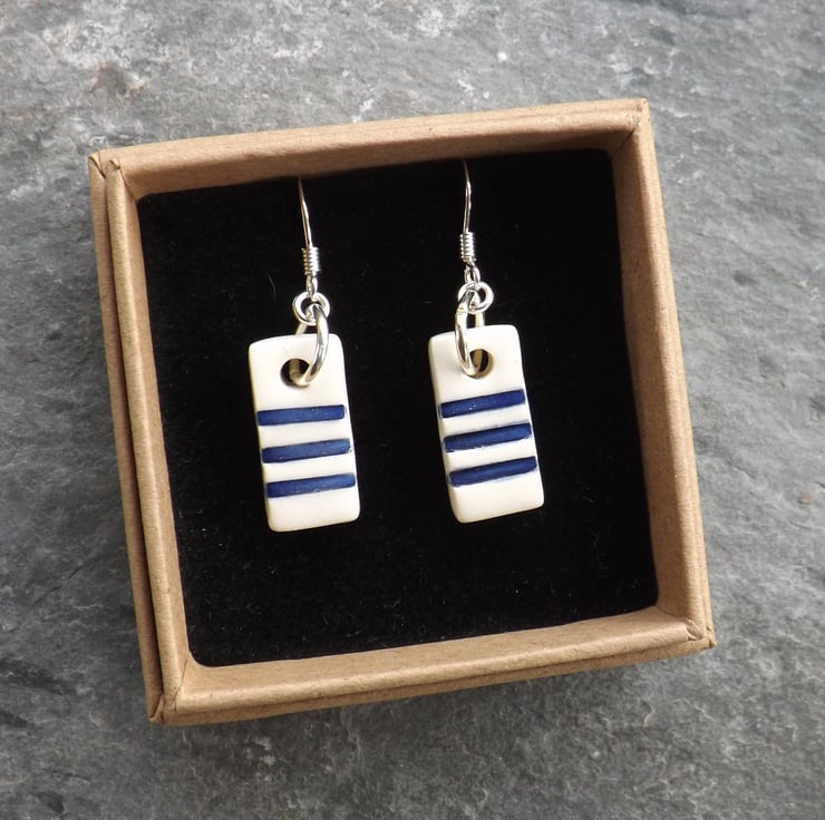 These earrings have stripes of deep blue on a white background. As with all my jewellery they are made and decorated entirely by hand.