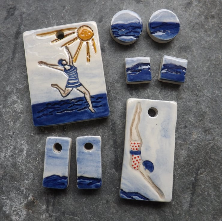 After forming the drops from fine white clay, I imprint the designs. When dry, I sand the sides and back, round off the corners to ensure they are super smooth to the touch. They then have their first firing. Next I paint them using under-glazes and apply a transparent glaze before firing again to earthenware. The ceramic is glazed all over so is very smooth whilst retaining the texture of the imprinted design. The result is a pleasantly tactile item.