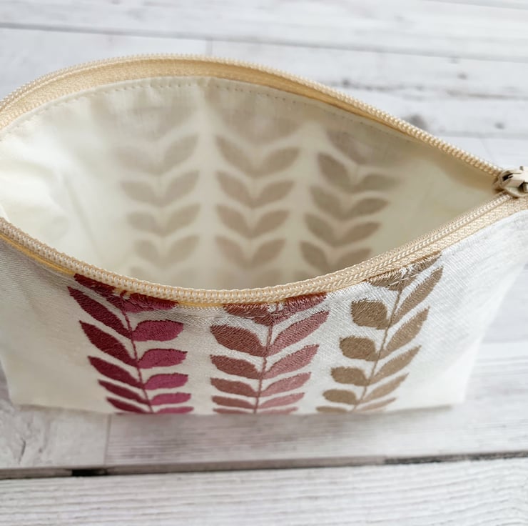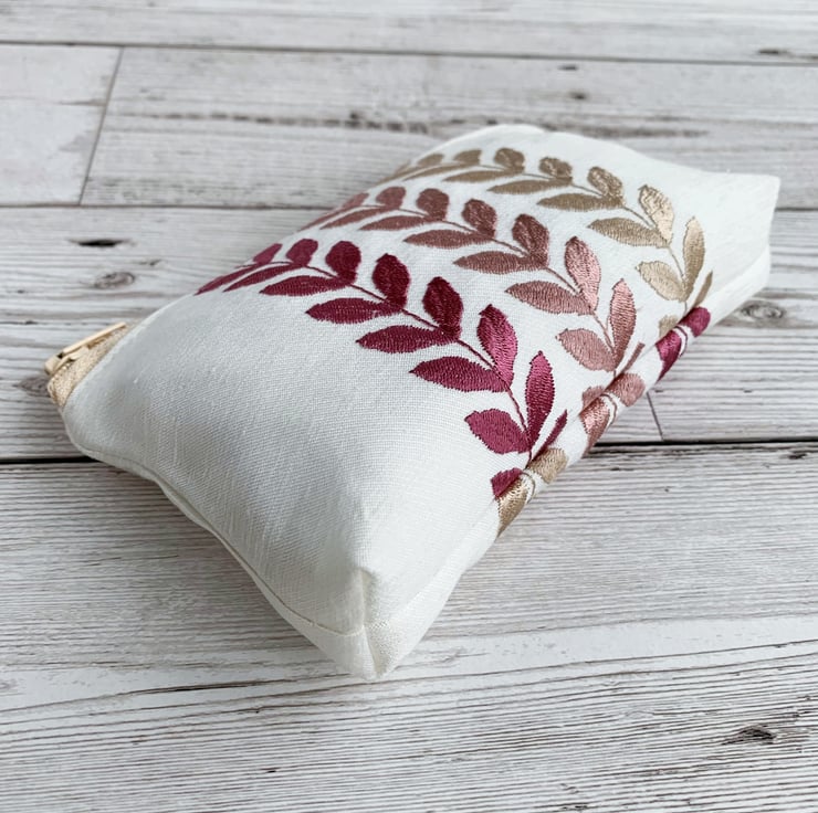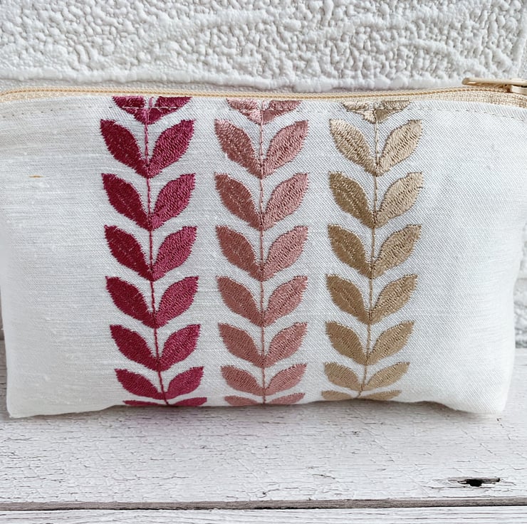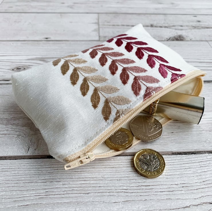 A large coin purse in embroidered leaf pattern fabric. This stylish purse is made from beautiful ivory fabric with a slight sheen and a raised embroidered leaf pattern. The pattern consists of three vertical stripes made up of paired leaves in dark pink, pale pink and beige-cream. The leaf pattern has a beautiful sheen. The coin purse has a peachy cream zip and is lined with cream fabric. The base of the purse is boxed to give more space inside.