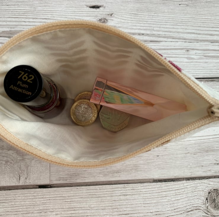 This large purse could be used as a coin purse and is large enough for bank cards and keys. It is also large enough to be used as a small make up bag or jewellery pouch. With its beautiful fabric, it would be perfect for a special occasion or would make a lovely gift.