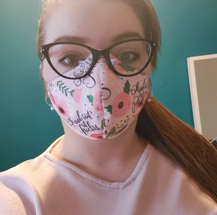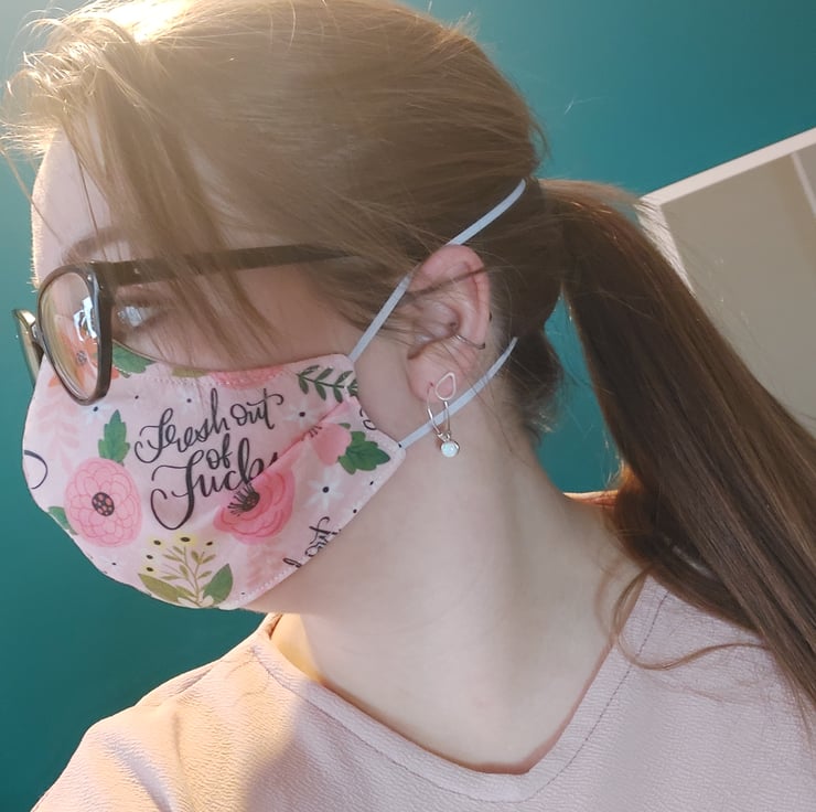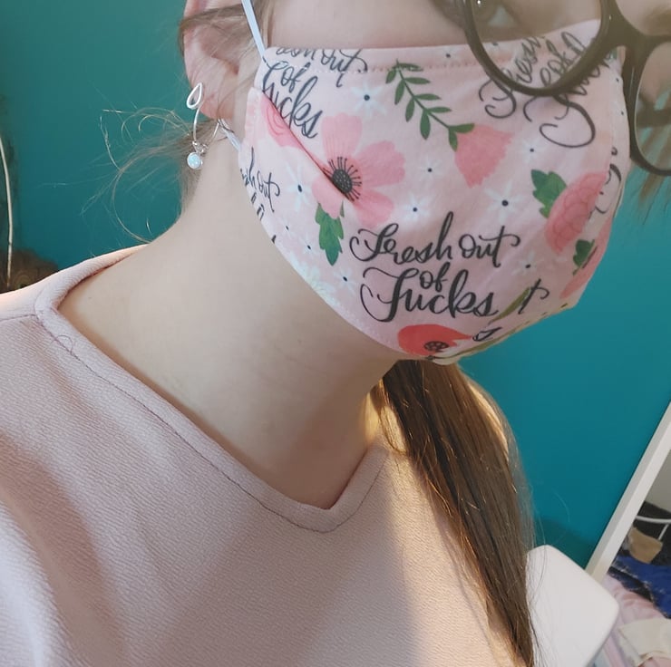 These are my newest bundle of masks this time in some brilliantly sassy prints because why not get a bit silly with them if we are in this for the long hall so i give you a beautiful baby pink with a floral print and text reading fresh out of f-cks