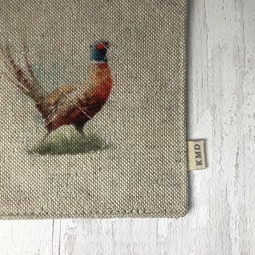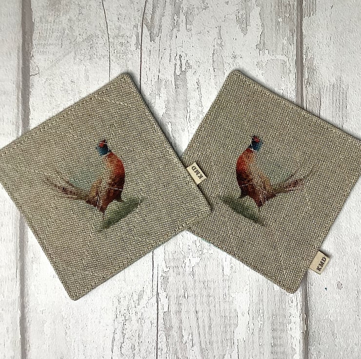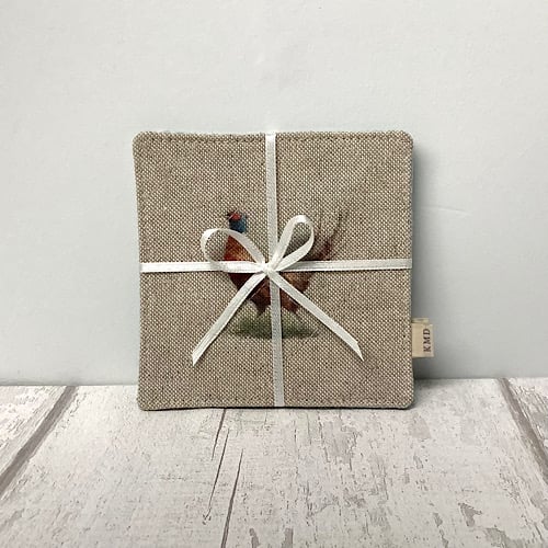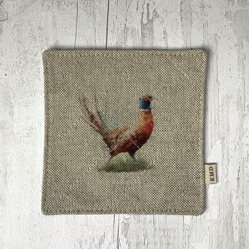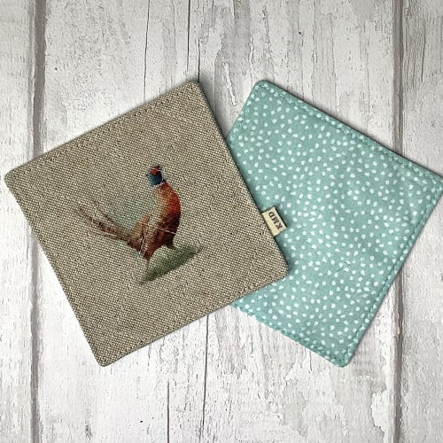 Fabric coaster set (x2) in a pheasant print on natural linen. with a grey spot fabric on the reverse. Quilted. 10cm by 10cm.