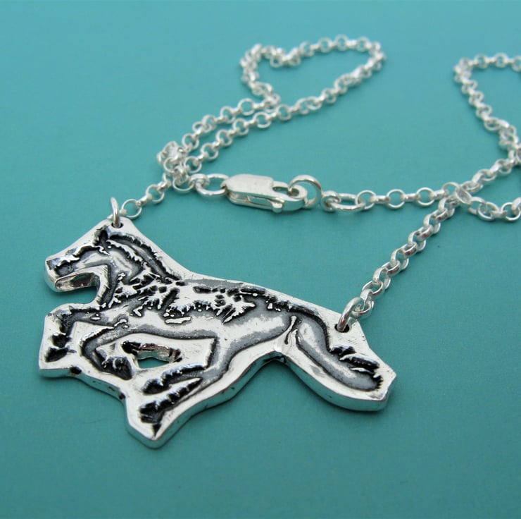The horse/pony is approx. 4 x 2 cm and hangs from a chunky sterling silver chain with good quality trigger clasp.