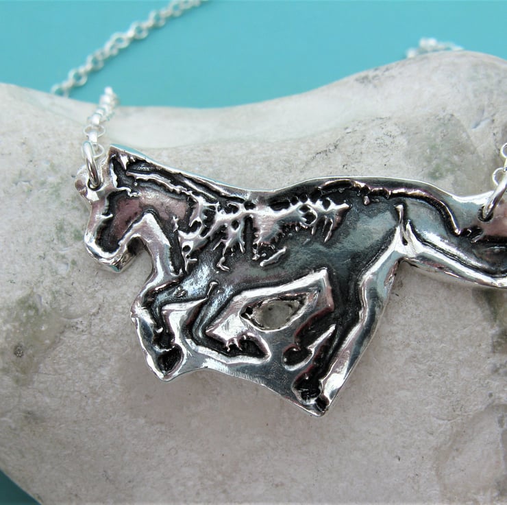 This stunning necklace was made by creating the imprint of a horse/pony in recycled fine silver (pure silver).