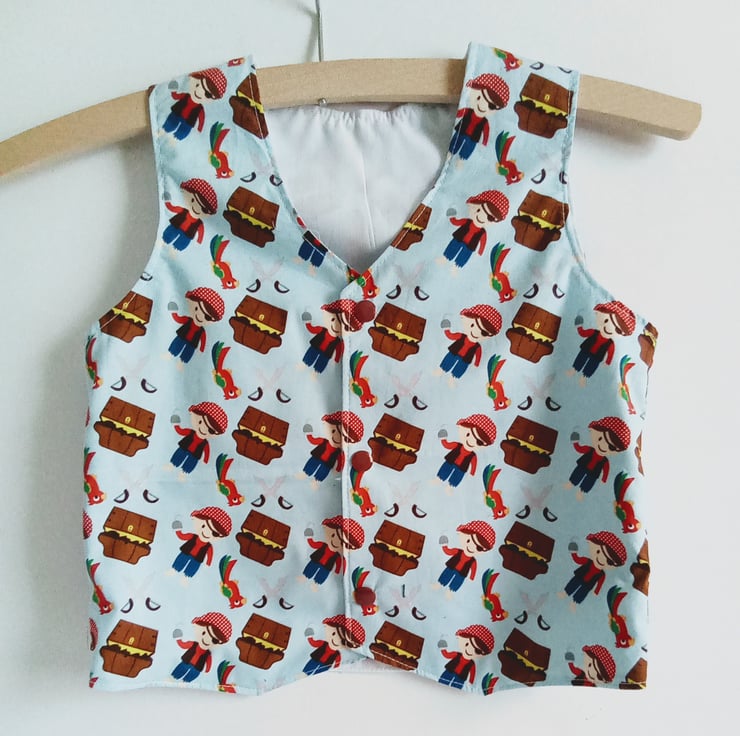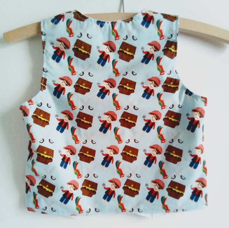 Waistcoat for boys with a pirate design in polycotton. It is fully lined with polycotton and fastened with plastic poppers.