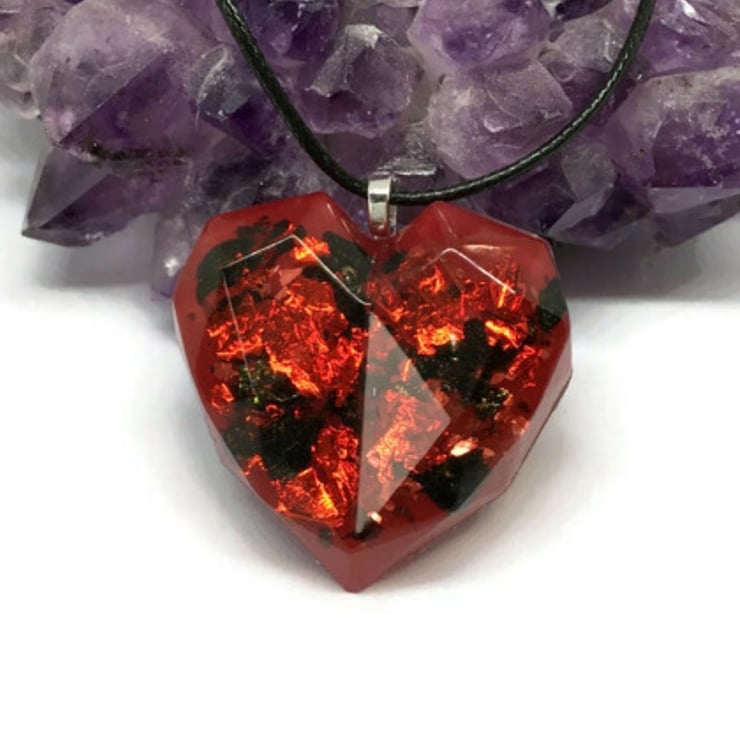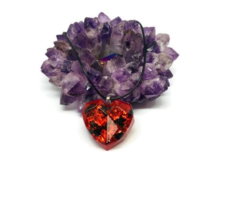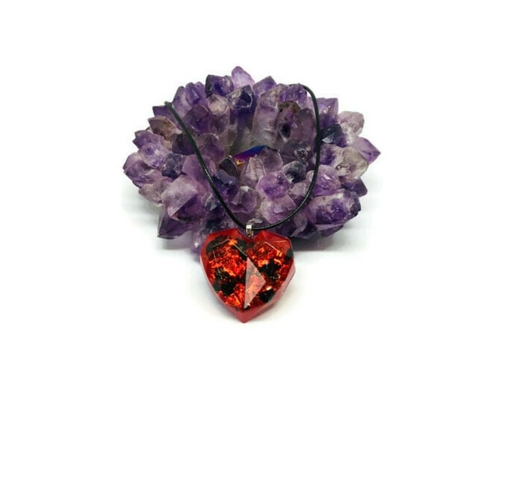 One of a kind sparkly statement heart necklace. I created this stunning pendant with red metallic and black obsidian mineral flakes mixed with red resin.
