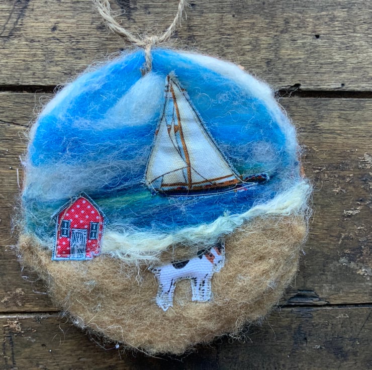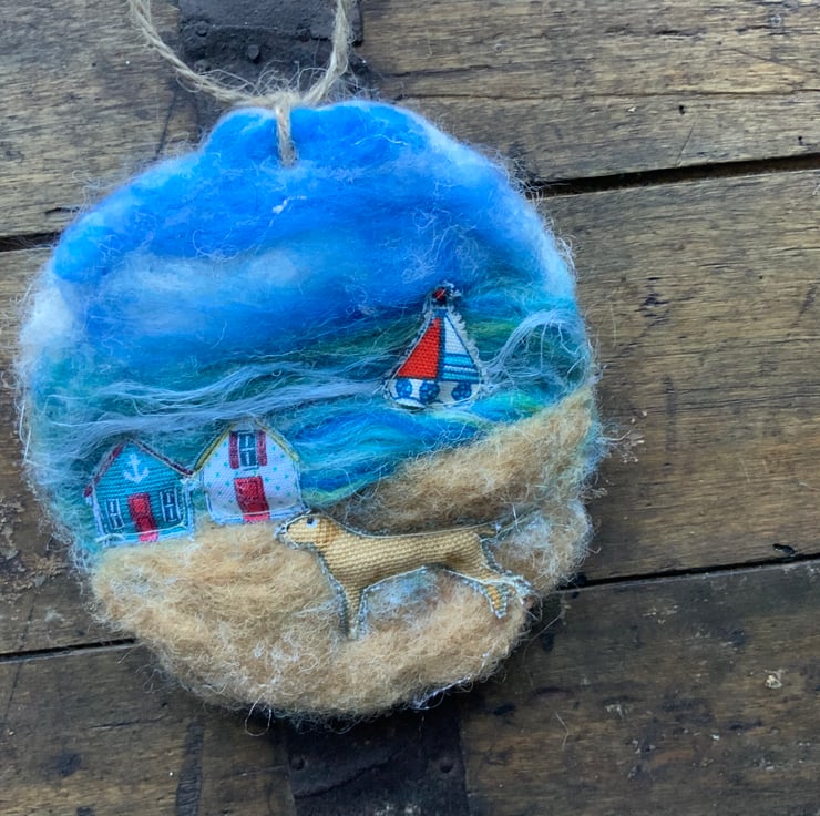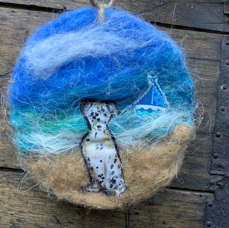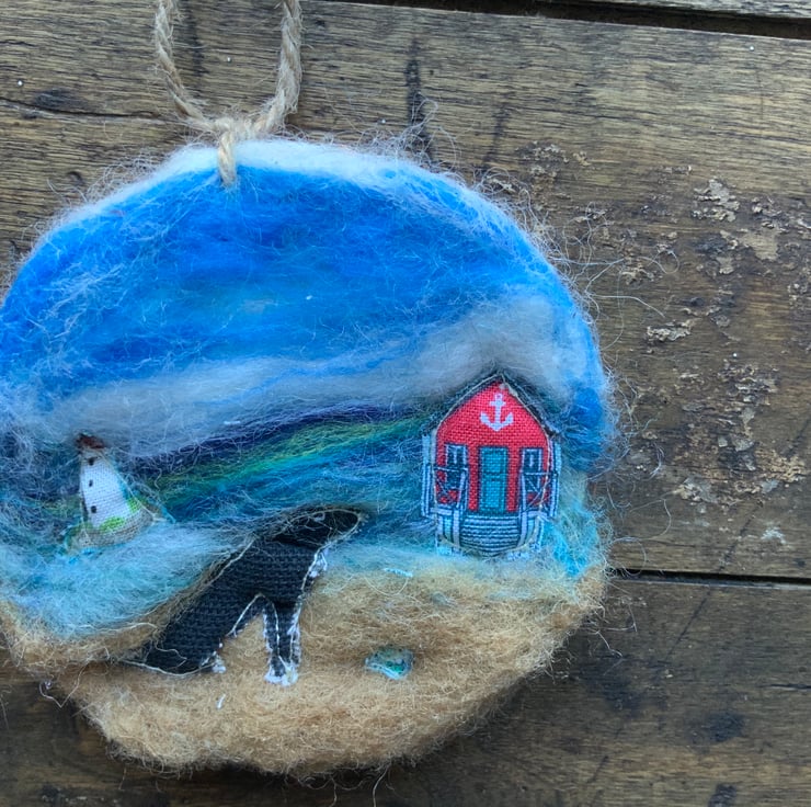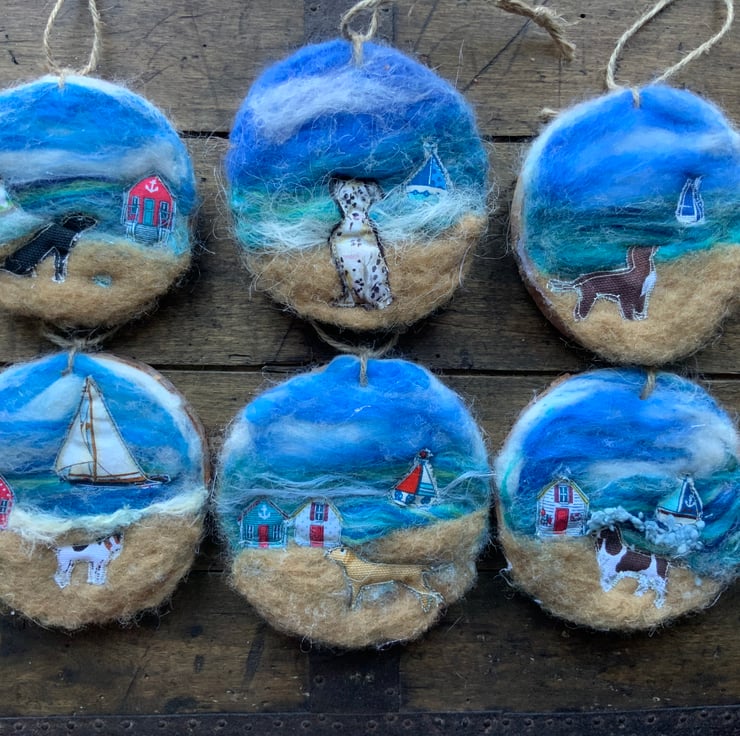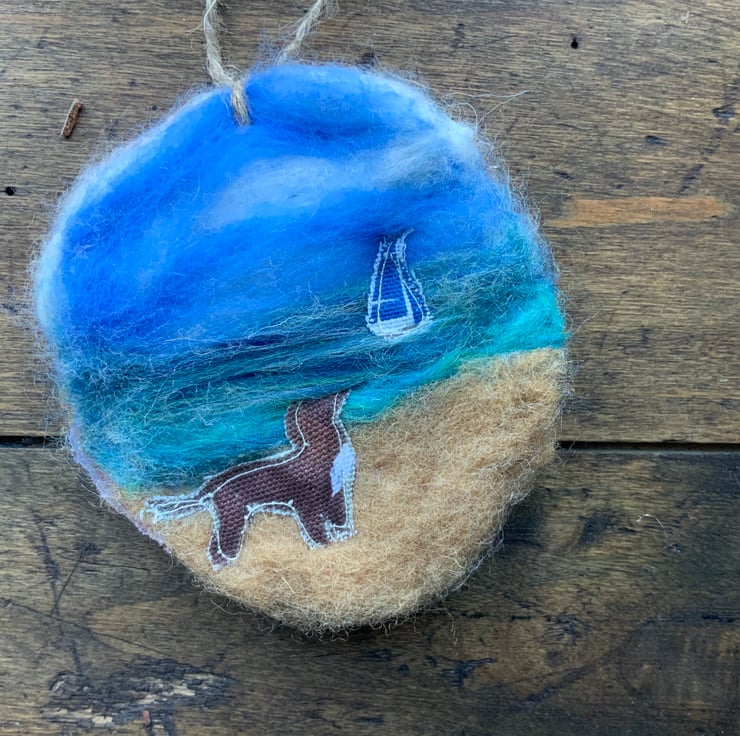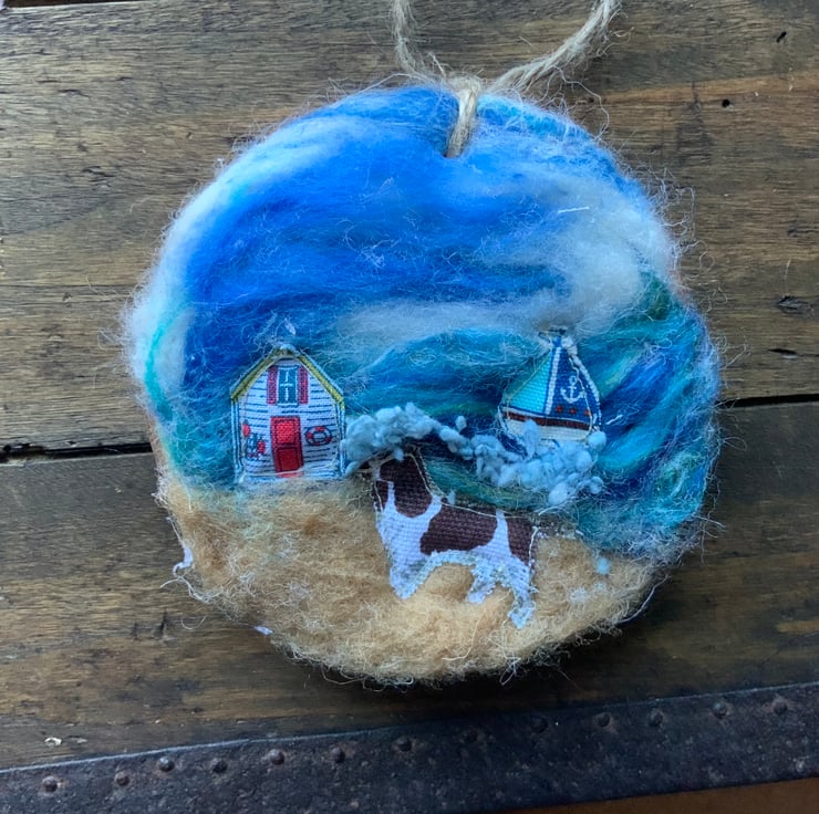 These absolutely Beautiful felted Dog on beach hanging decorations. Hand felted