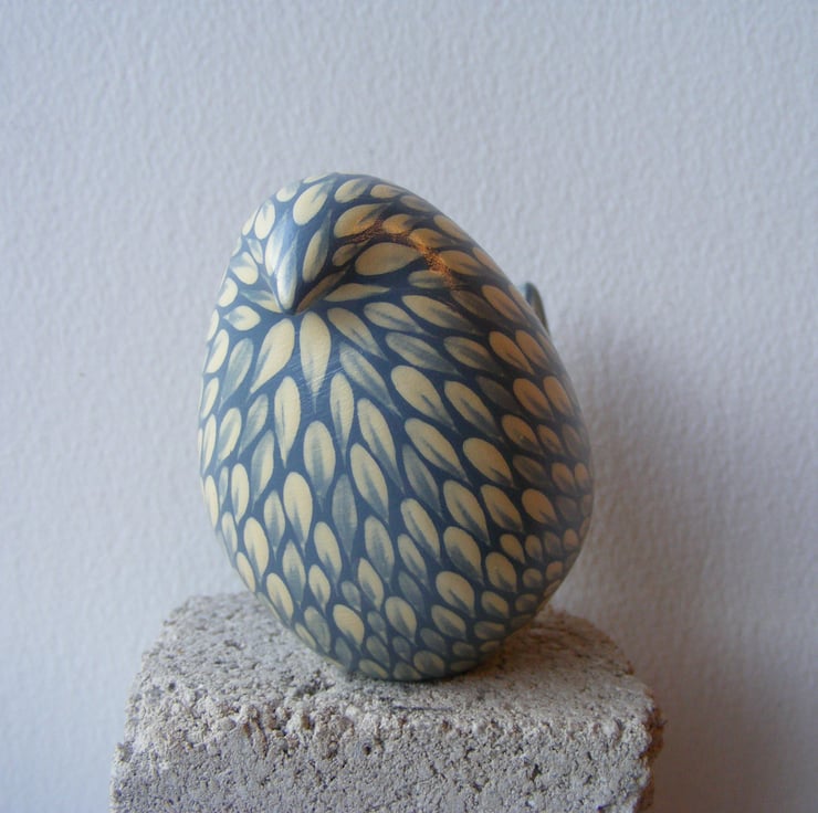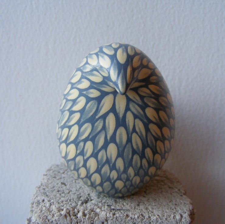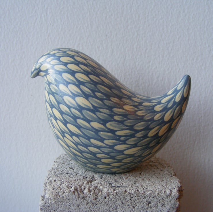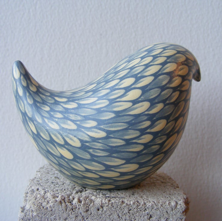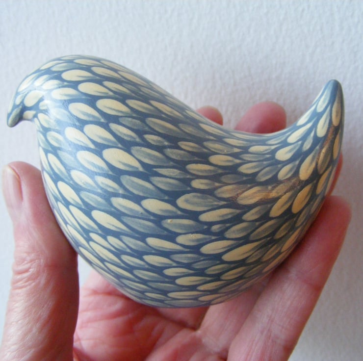 This painted bird measures 6cm high and 9cm long (2.5” x 3.5”) It is made from white earthenware clay. After firing I decorate the bird with acrylic paint, each feather mark is a single brush stroke. I used to paint folk art images on pots and out of all the animals I used I was fascinated with the plumage of colourful cockerels, so instead of painting a picture on the side of pots, I thought I would make a bird and tried to replicate the beautiful feathers with this painting technique that I have developed over the years. The bird has been varnished to protect the decoration. As this is a painted item please keep out of strong sunlight for prolonged amounts of time.