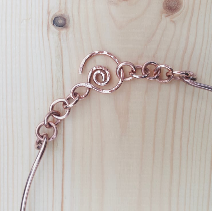 The total of the torque necklace circumference is 20 inches or 50cm and is made from 2.64 mm diameter round wire. It is hammered at the front so is flatter and wider here (around 4mm).
