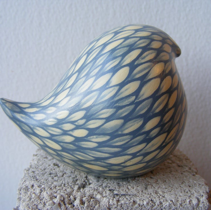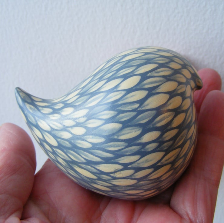 This bird is hand made and measures, approx 6cm high and 6.5cm long. It is made from white earthenware clay and fired first in an electric kiln. I use acrylic paints to paint on a base colour and then paint on the feather marks, each one is a single brush stroke. The bird is the varnished to protect the decoration and please keep out of strong sunlight to preserve the colours.
