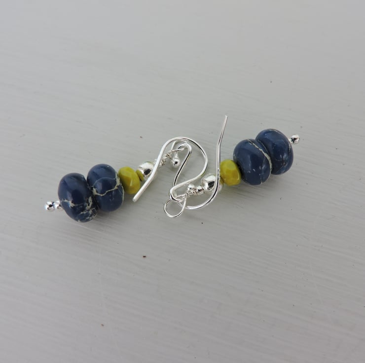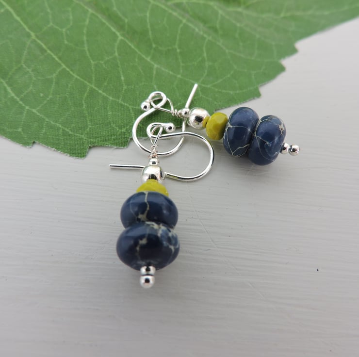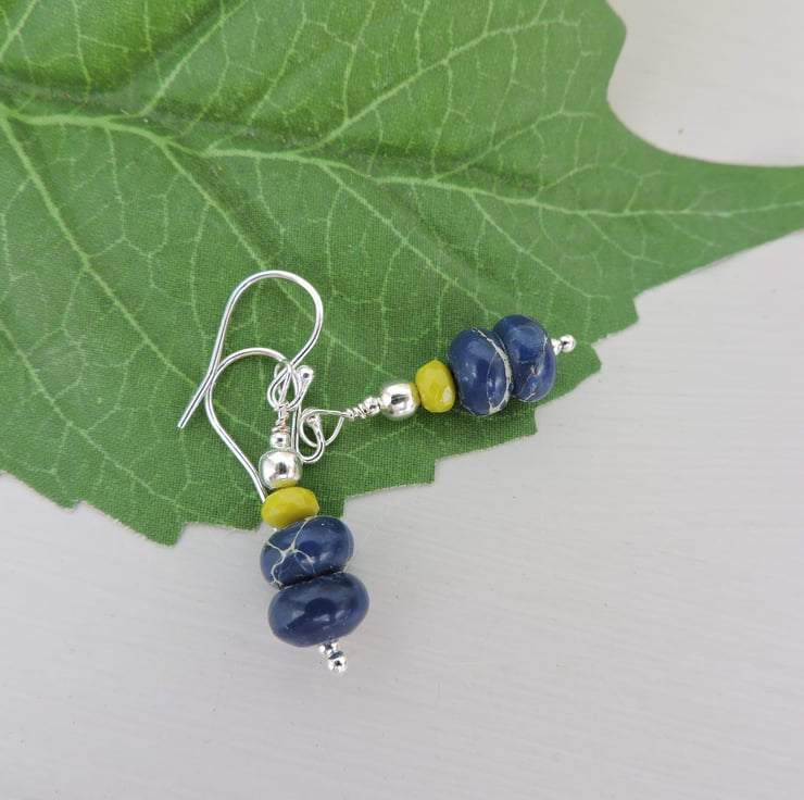 This pair of drop earrings have been made with dark blue and cream Impression Jasper beads, little lime green facetted beads and sterling silver spacer beads. Silver fish hook ear wires. Pretty lightweight earrings.