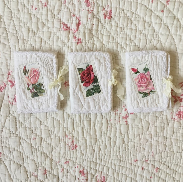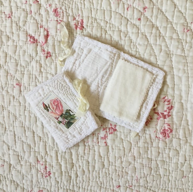 The main fabric is a piece of antique hand quilted Durham quilt. Edges are bound with vintage cotton lace. Decorated with a rose printed, vintage Wills cigarette card. The needle case fastens with cream crinkle ribbon ties. Contains 4 pages of soft cotton Wincyette fabric to store your pins and/or needles.