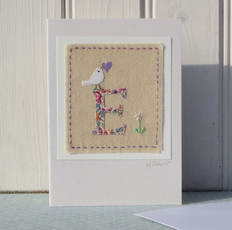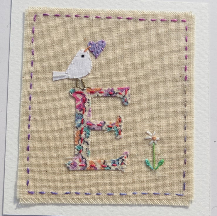 A small hand-stitched textile mounted onto a card with the letter 'E' cut from pretty floral fabric stitched into place with tiny stitches. I have added a miniature applique dove with heart in her beak, and then embroidered a tiny daisy flower to complete the design.