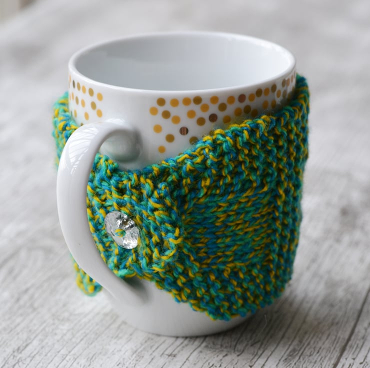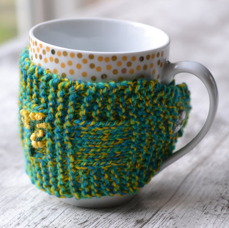 Knitted in garter stitch in 100% acrylic. Knitted in a marl yarn in yellow, bright emerald and kingfisher blue. I have embroidered a flowing blossom tree onto the cozy. It fastens with a clear crystal faceted button and fits standard size mugs and regular costa coffee cups. I have sewn a coconut shell button in the centre of the flower. I can make this in other colours.